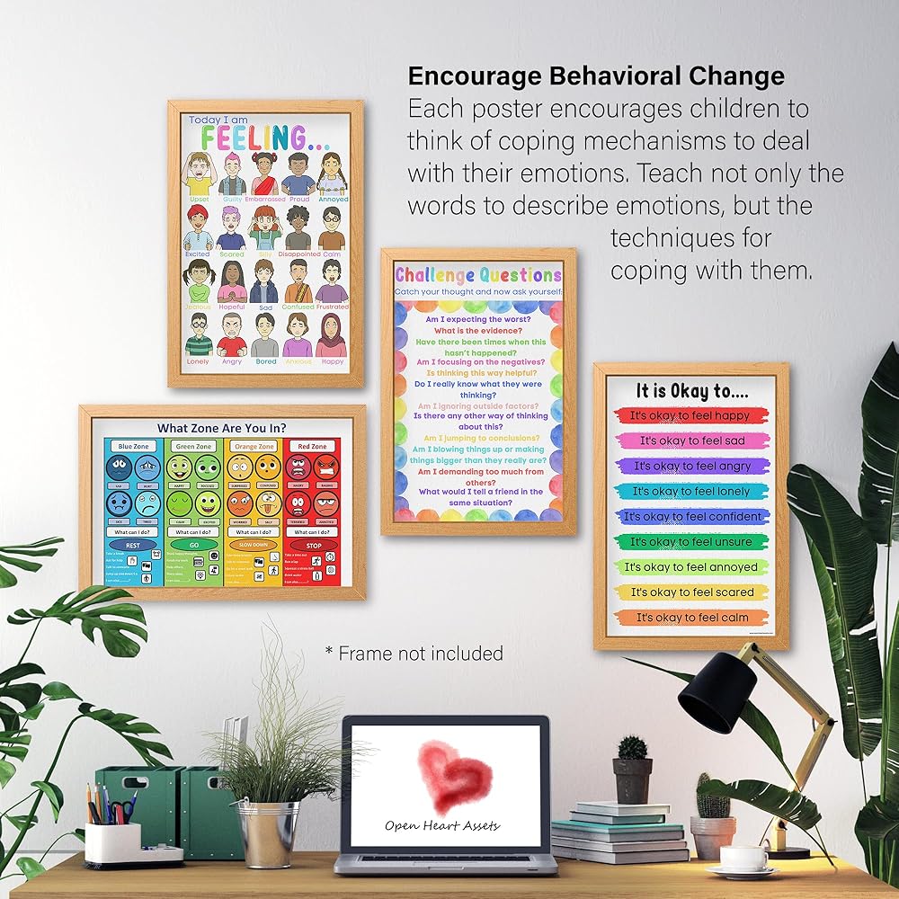 تشجع على تغيير السلوك - يشجع أحد ملصقاتنا الـ 12 الأطفال على التفكير في آليات التأقلم للتعامل مع مشاعرهم. لا تعلم فقط الكلمات لوصف المشاعر، ولكن تقنيات التعامل معها. هذه العبوة المكونة من 12 قطعة من ملصقات الفصول الدراسية للصحة العقلية تعلم كليهما.
