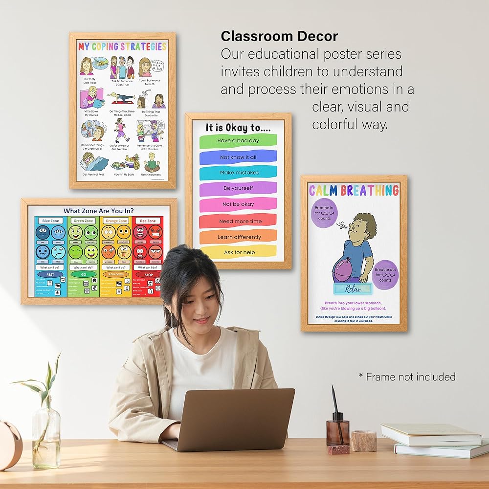 مثالية للمستشارين - بالنسبة لأي مستشار مدرسي، فهي ضرورية لديكور مكتبك الاستشاري. ابتكر مرجعًا بصريًا سهلاً للأطفال لفهم مشاعرهم وتقنياتهم للتعامل معهم.