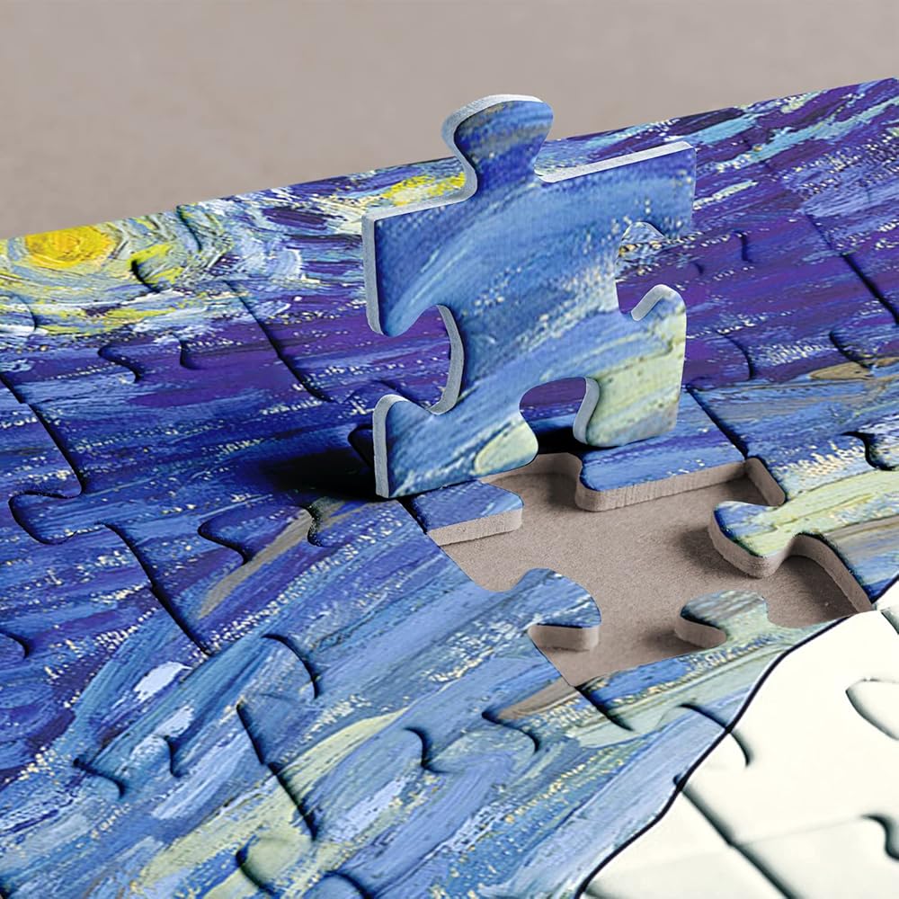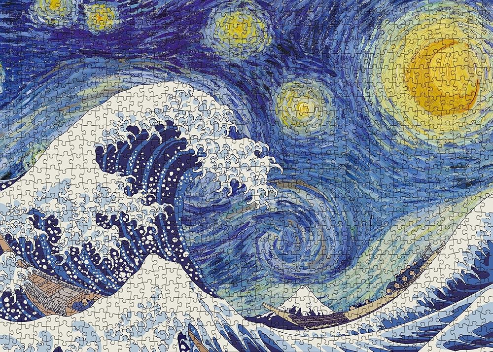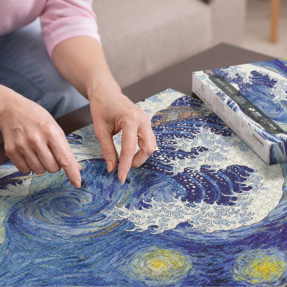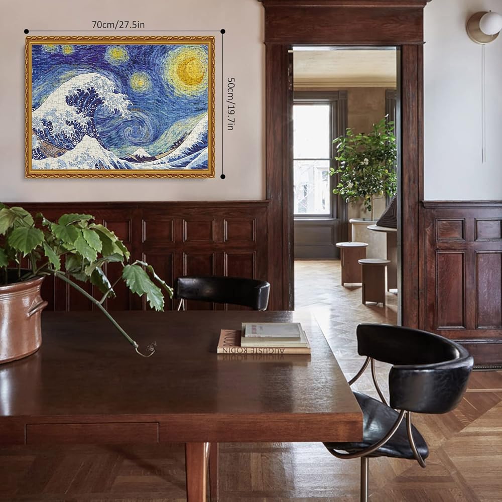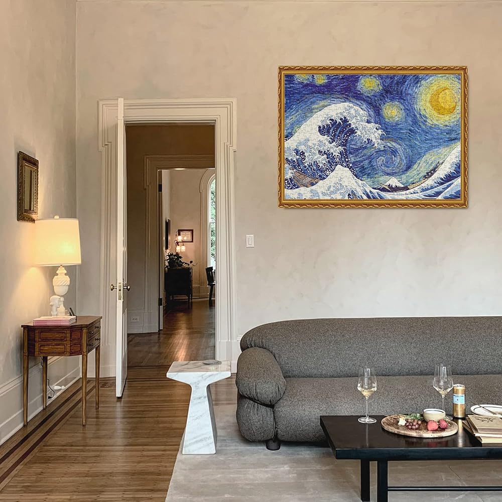 موجة النجوم: أحجية الصور المقطوعة الفنية هذه المكونة من 1000 قطعة للبالغين هي مزيج من ليالي النجوم لفنسنت فان جوخ وكاتسوشيكا هوكوساي ذا جريت ويف اوف كاناغاوا. تخلق أحجيات المتاحف للبالغين رؤية مذهلة. يمكنك تقدير كلتا اللوحتين في وقت واحد بعد إكمال أحجية العمل الفني.