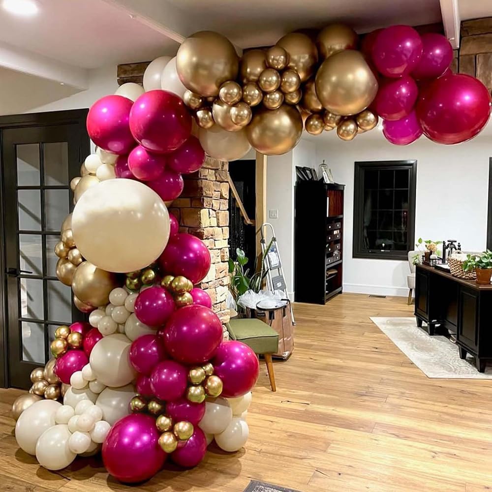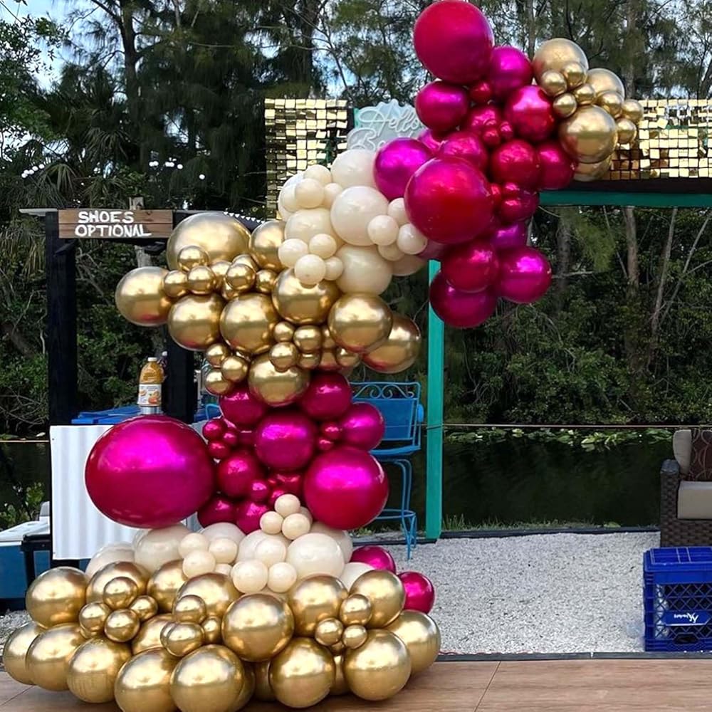 إكليل بالونات بلون وردي فاقع من الكروم: بالونات مزدوجة محشوة باللون الوردي الساخن والأبيض الرملي، ذهبي معدني يشكل قوس البالونات هذا. نضيف بالونات أرجوانية مزدوجة محشوة للمساعدة في خلق جو أكثر رومانسية. مجموعة البالونات الخاصة بنا مناسبة لحفلات استقبال المولود الجديد والتخرج والزفاف وحفلات توديع العزوبية وحفلات الزفاف والذكرى السنوية والخطوبة وحفلات أعياد الميلاد أو أي مناسبة ملونة!
