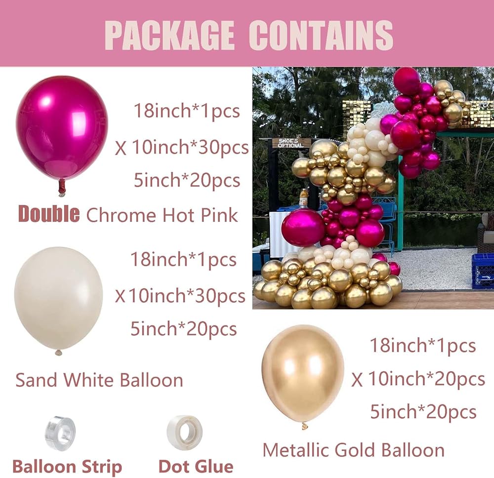تتضمن العبوة 145 قطعة: 51 قطعة بلون زهري فاقع مزدوج (5/10/18 انش) 51 قطعة باللون الأبيض الرملي (5/10/18 انش)، 41 قطعة بالون ذهبي معدني (5/10/18 انش)، 1 قطعة من شريط إكليل البالونات، قطعة واحدة من نقاط الصمغ. تحتوي على كل ما تحتاجه إذا كنت ترغب في صنع قوس بالونات بنفسك.