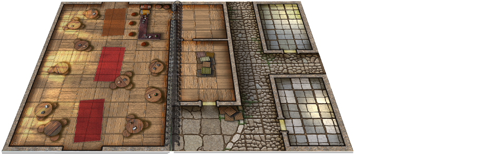 360؟ يسمح العمود الفقري للكتاب بالوضع بشكل مسطح أو طيه إلى نصفين ليناسب اللقاءات أو المساحات الصغيرة. قابلة للتكيف مع أي متطلبات لعبة.