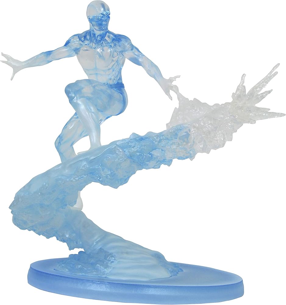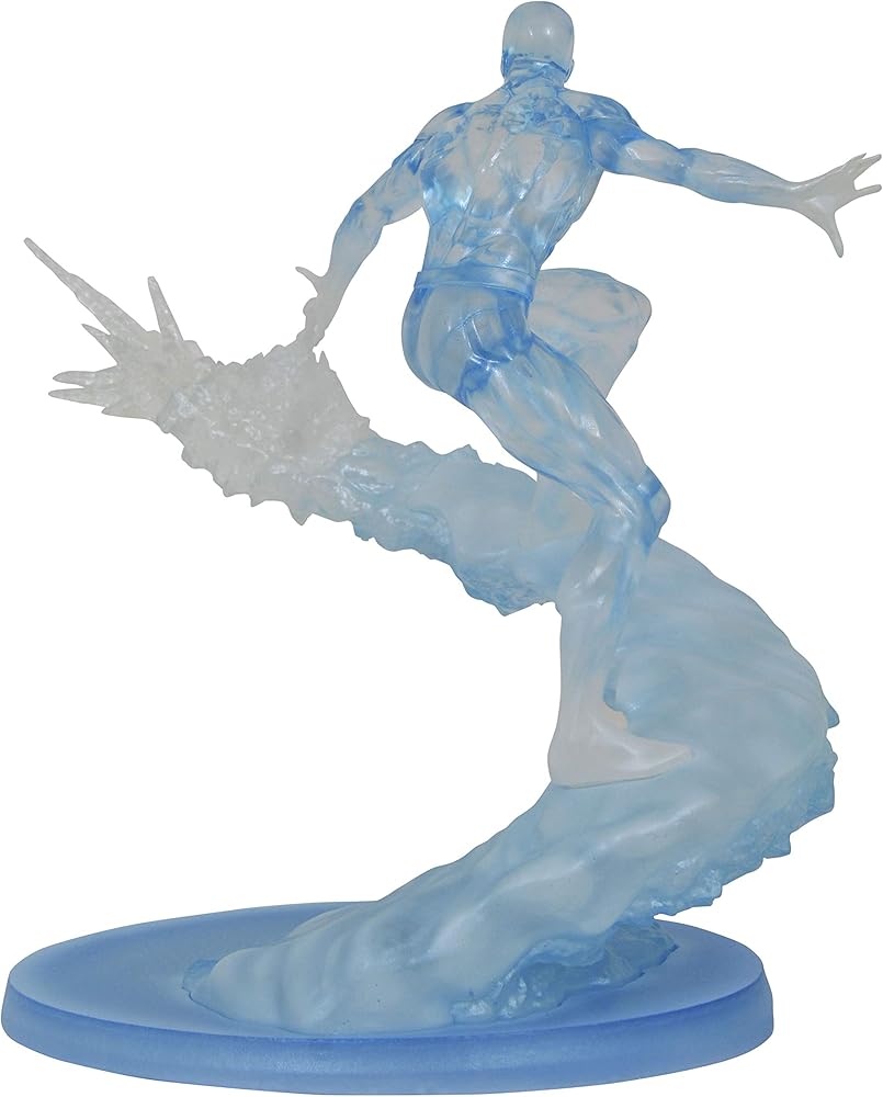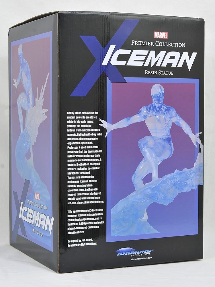 إصدار دايموند سيليكت تويز! هذا تمثال رائع! مؤسس اكس مان بوبي "رجل الثلج" دريك ينزلق على مسار جليدي في هذا التمثال الرائع المذهل. مصنوع من مادة شفافة ويبلغ طوله حوالي 11 انش، ويقتصر هذا التمثال الديناميكي على إصدار من 3000، ويأتي معبأ مع شهادة الأصالة في صندوق ملون بالكامل. صممه جو الارد، منحوت بواسطة مات برويلارد.