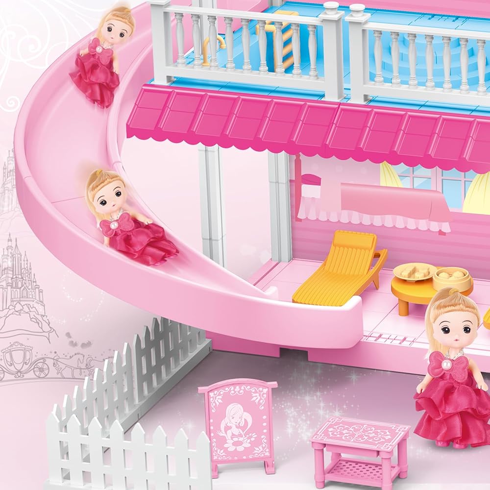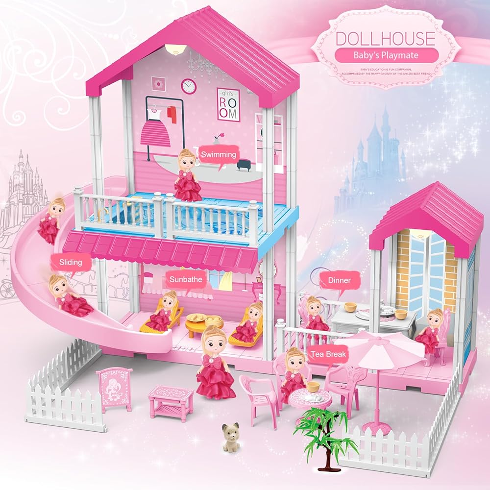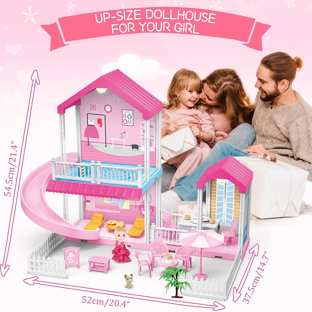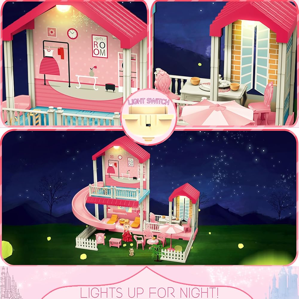 ألعاب بيت الدمى من نيراجرون، بيت الدمى دريم للفتيات مع منزلق، حمام سباحة، أثاث وإكسسوارات، لعبة التظاهر لبيت الدمى الوردي للفتيات 3 4 5 6 7 8 سنوات