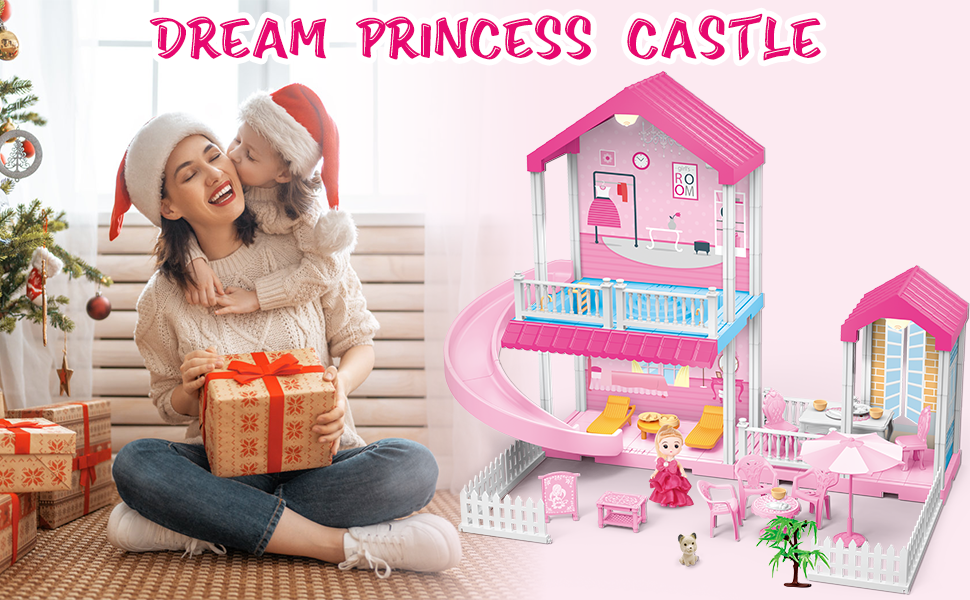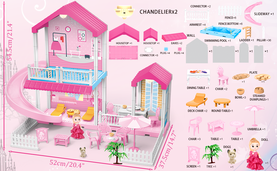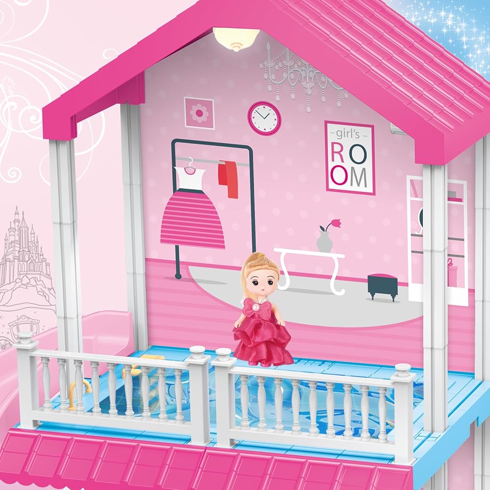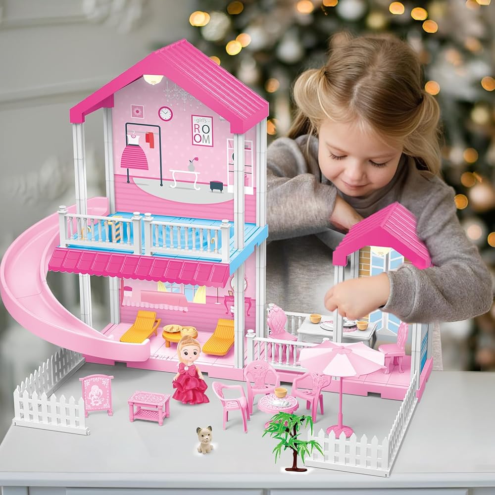ألعاب بيت الدمى من نيراجرون، بيت الدمى دريم للفتيات مع منزلق، حمام سباحة، أثاث وإكسسوارات، لعبة التظاهر لبيت الدمى الوردي للفتيات 3 4 5 6 7 8 سنوات