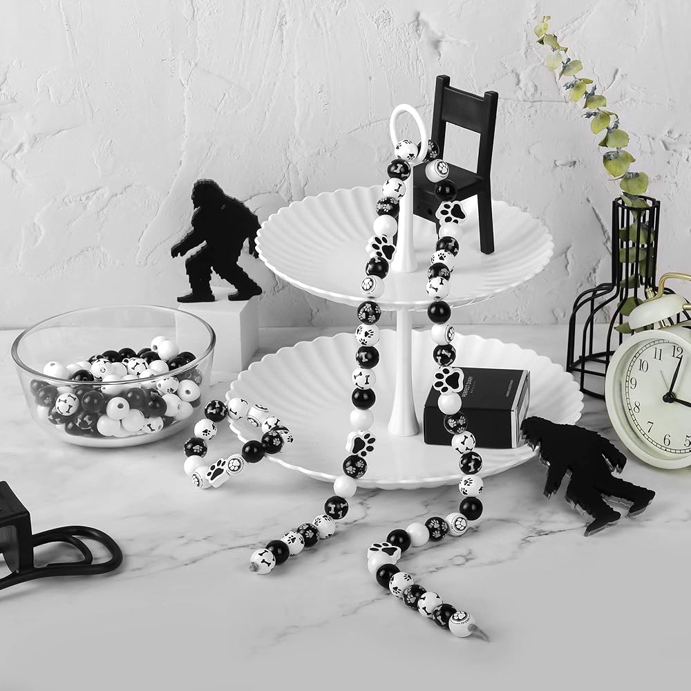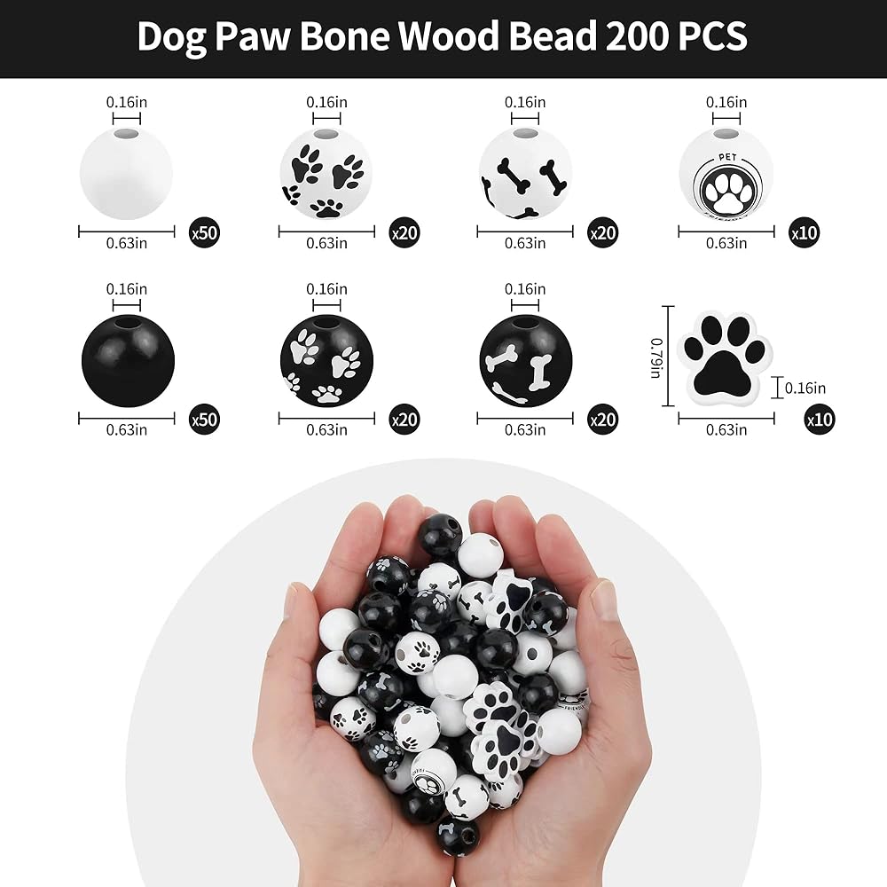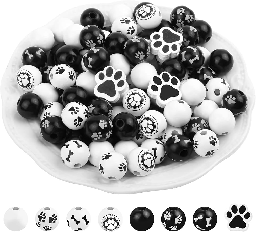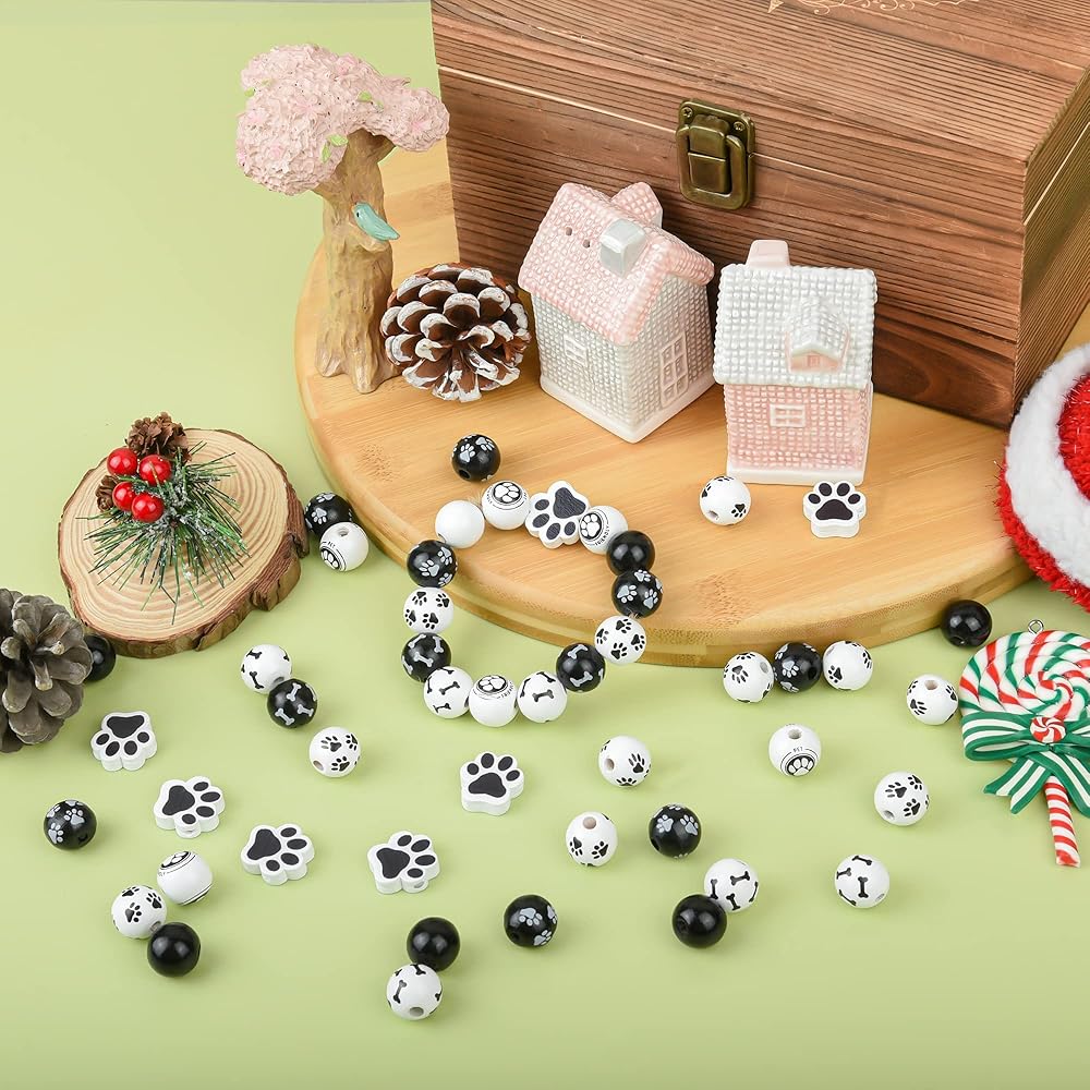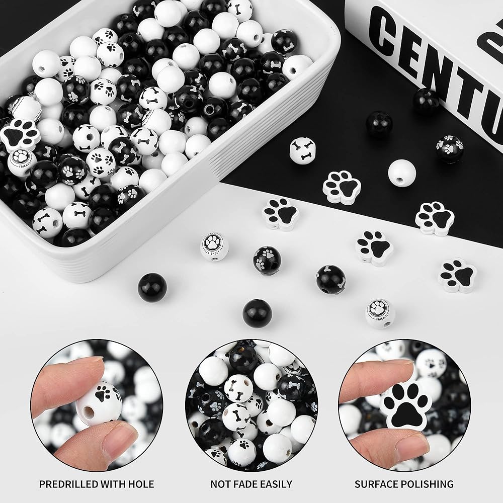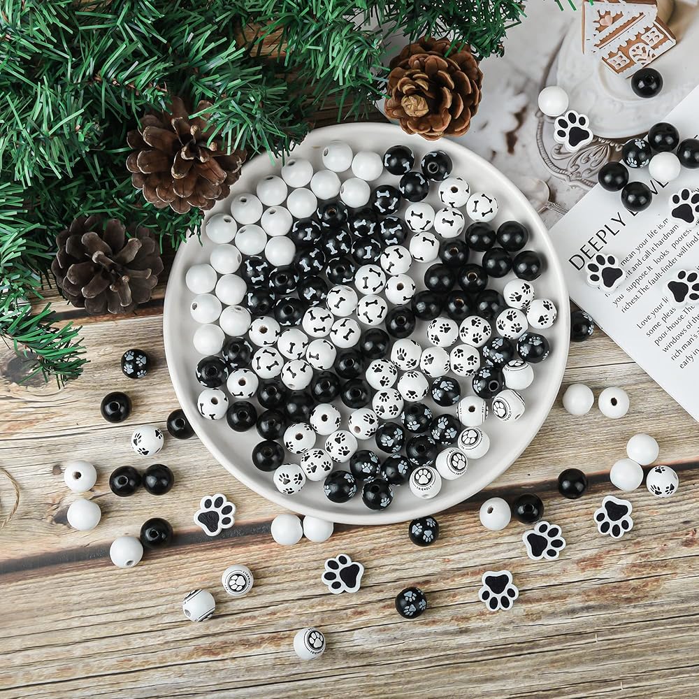 200 قطعة من الخرز الخشبي على شكل عظم مخالب الكلب من الخرز الخشبي باللونين الاسود والابيض، خرز فاصل لبصمات قدم الجراء، خرز فاصل خرز لصنع المجوهرات والعلكة لعيد الفصح والحرف اليدوية وديكور المنزل