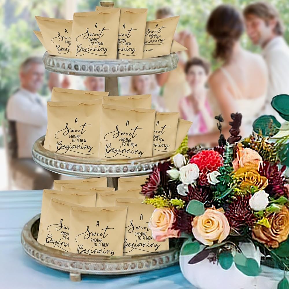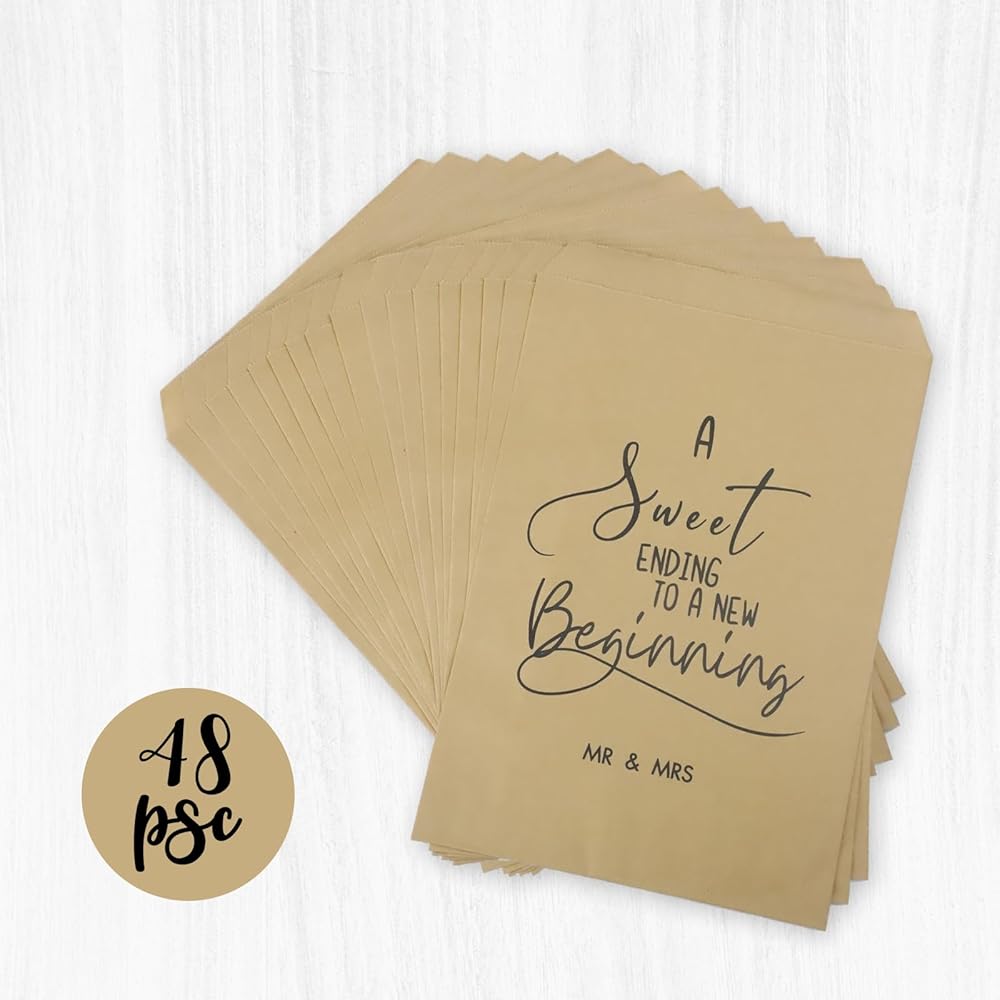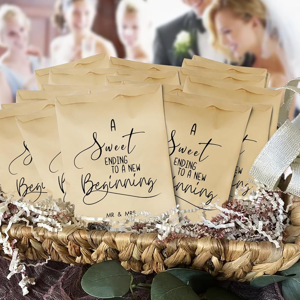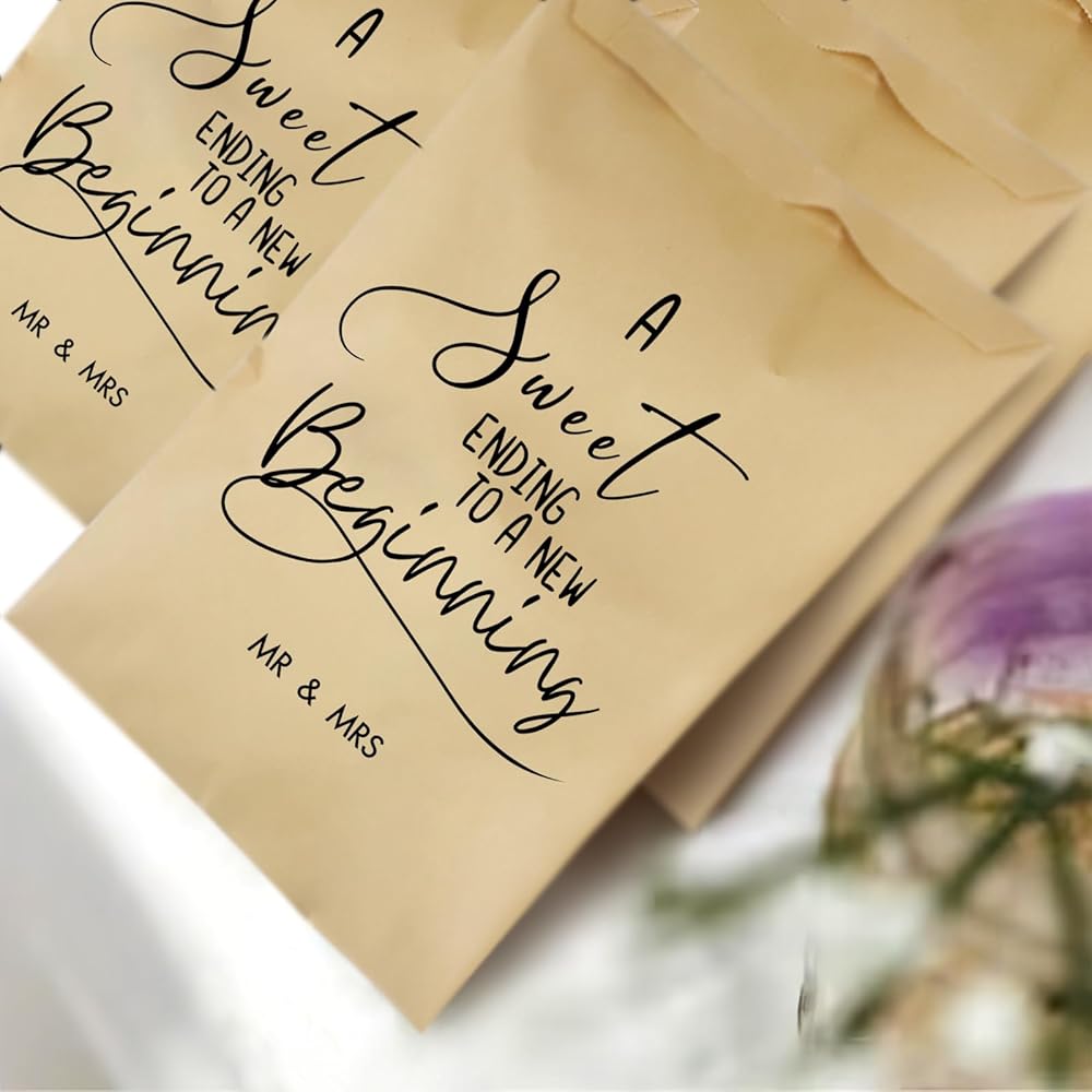 • A Sweet Ending to A New Beginning Wedding Favor Bags will be a great gift to give at Wedding party Decorations. Who doesn't love Dessert,and these paper bags will add such a rustic feel to your wedding favors