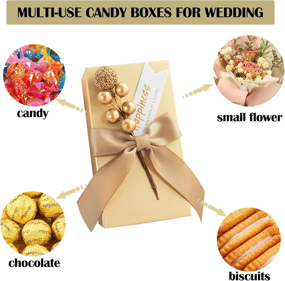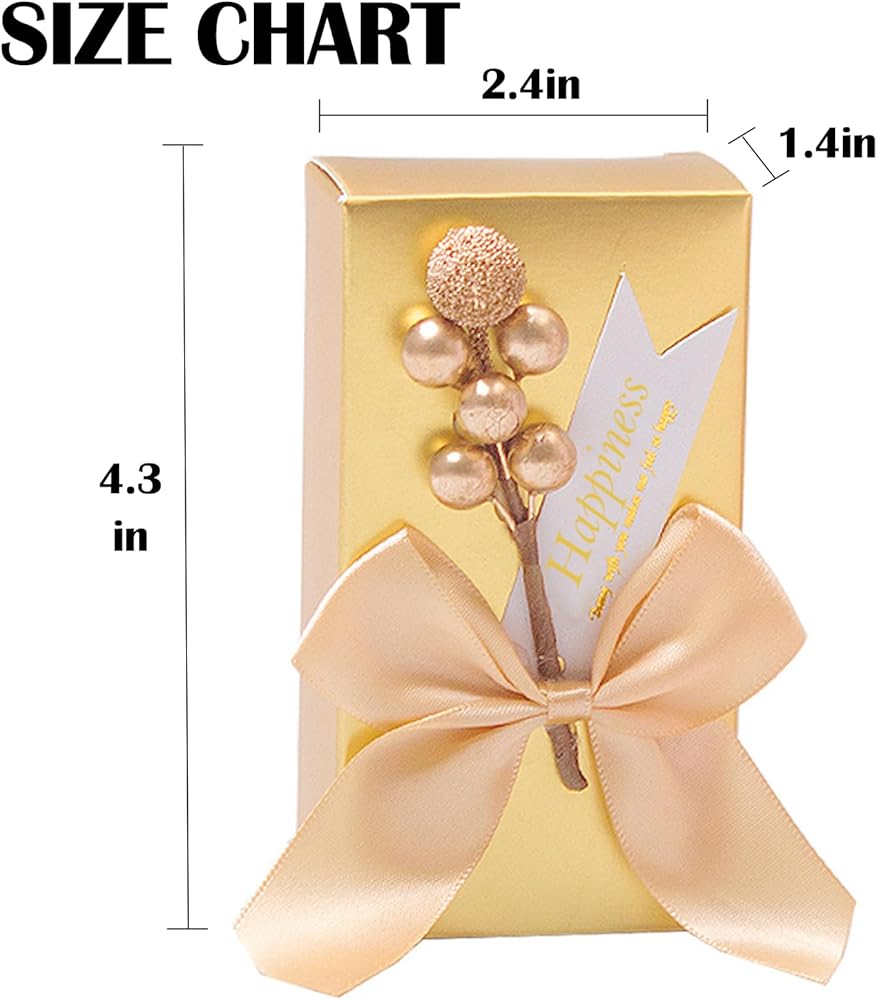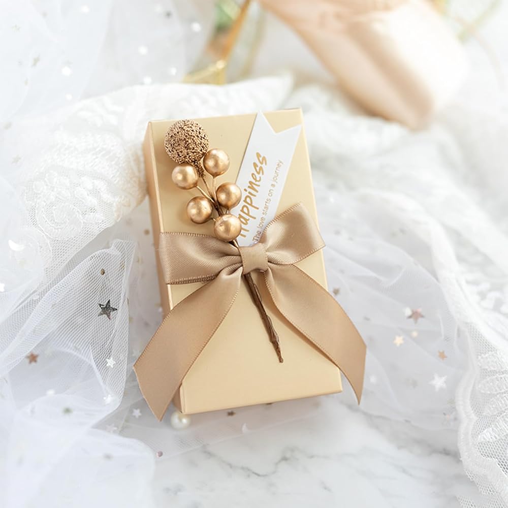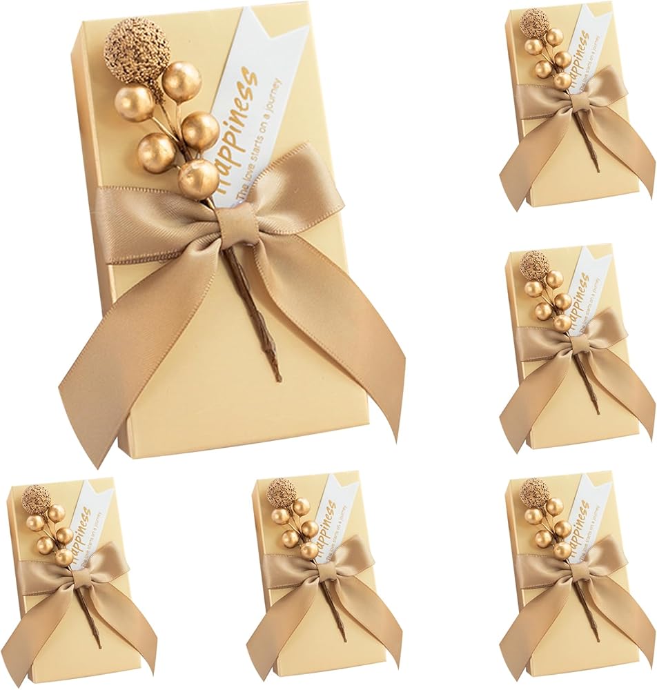 صناديق هدايا صغيرة ذهبية - كل صندوق هدايا ذهبي مصنوع من ورق مقوى عالي الجودة متين وقابل لإعادة الاستخدام. شريط الساتان مصنوع من البوليستر الذي يمكن ربطه بسهولة ليكون فيونكة جميلة.
