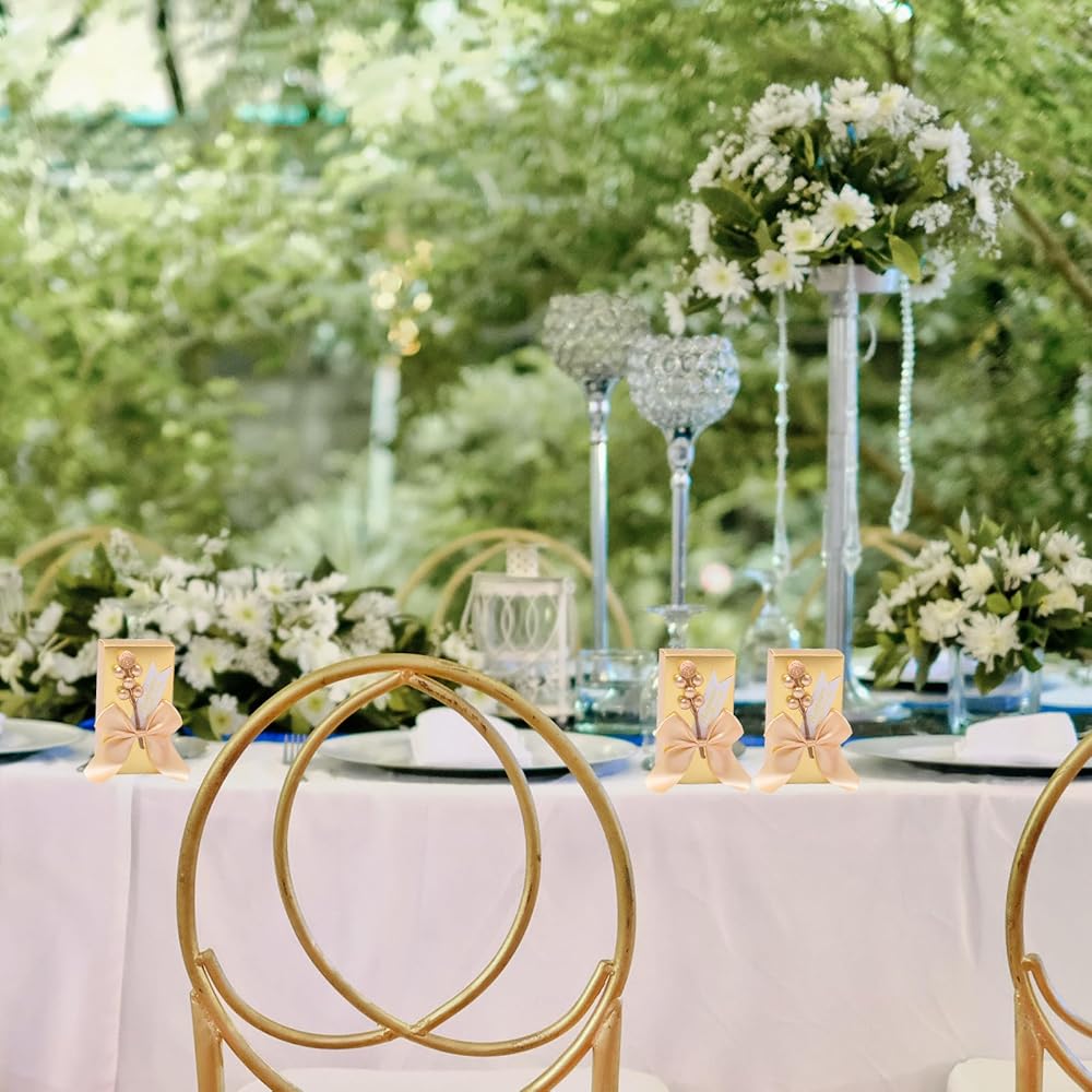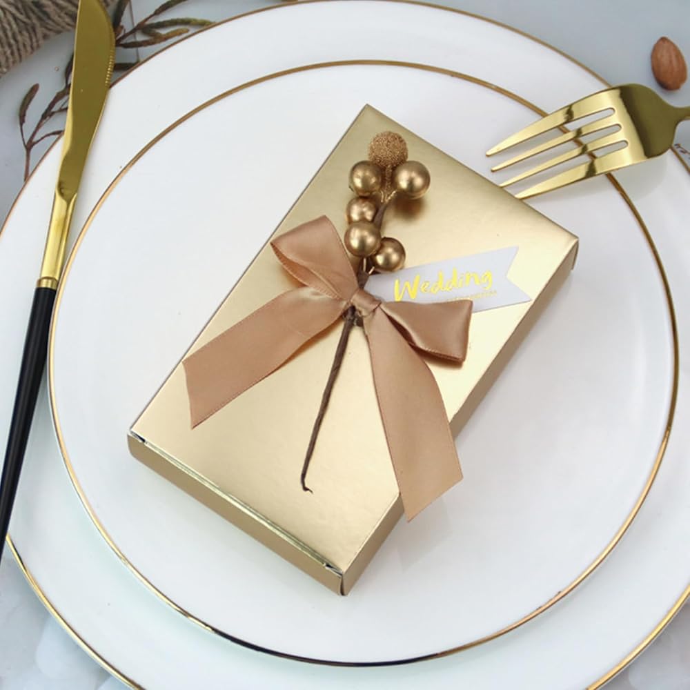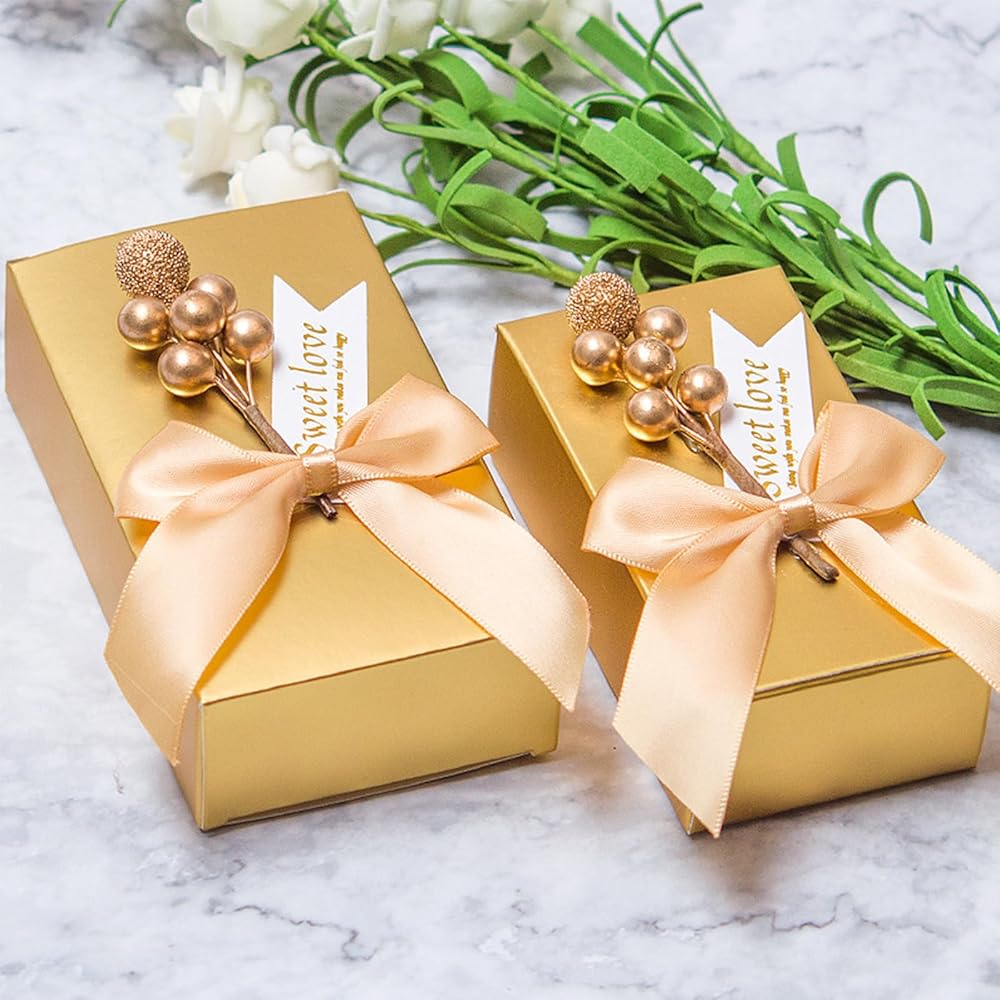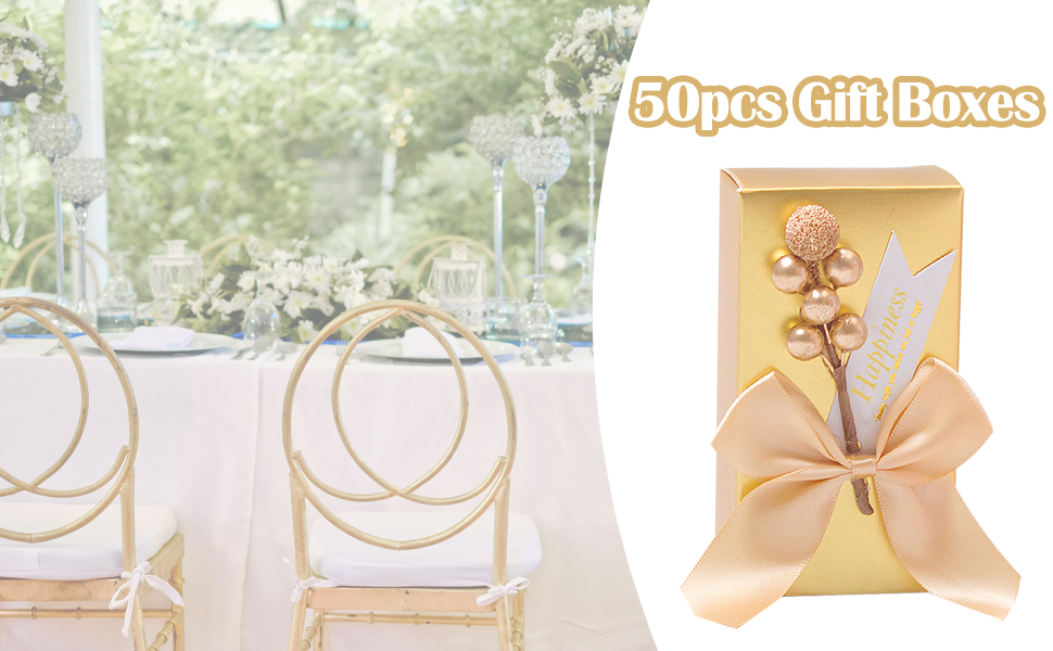 صناديق هدايا صغيرة ذهبية - كل صندوق هدايا ذهبي مصنوع من ورق مقوى عالي الجودة متين وقابل لإعادة الاستخدام. شريط الساتان مصنوع من البوليستر الذي يمكن ربطه بسهولة ليكون فيونكة جميلة.