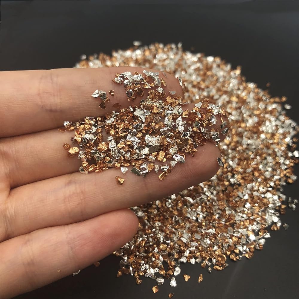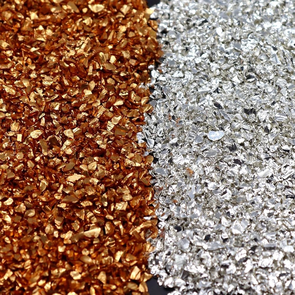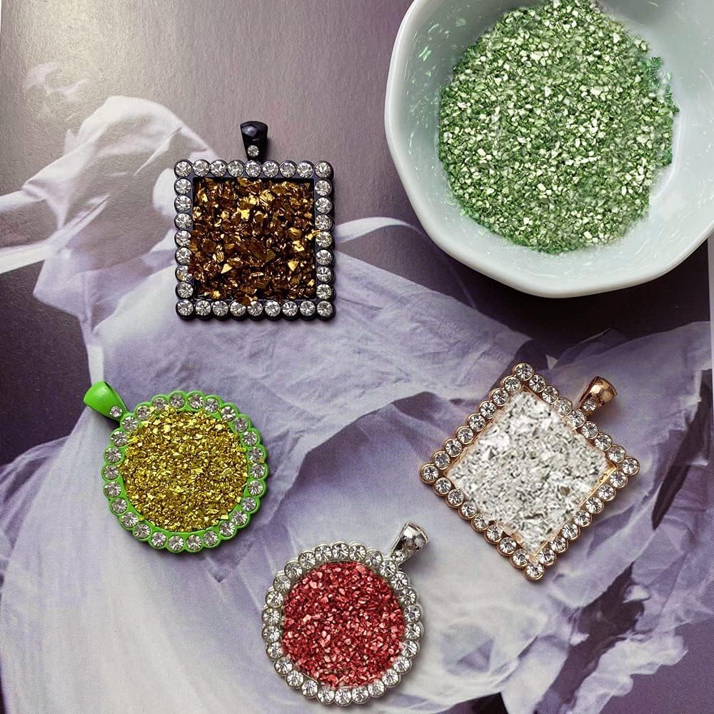 الزجاج المكسر الملون المعدني مصنوع من حصى صغير ملون معدني عالي الجودة، زجاج مطحوق، ليس من السهل أن يبهت، الزجاج، لذلك لا توجد حواف حادة، خصائص معدنية لامعة، يمكن أن تجعل الحرف اليدوية الخاصة بك تبدو أكثر روعة. يتم استخدام هذه الرقائق الزجاجية غير المنتظمة على نطاق واسع في الديكور، مثل فن الأظافر، قالب الراتنج، الحرف اليدوية، بطاقات المعايدة، الأعمال الفنية، ديكور الايبوكسي وسجلات القصاصات. زخارف زخرفية,vحشو اسيس، صناعة المجوهرات، الإطار، تزيين حامل الشموع وحافظة الجوال، تزيين الملابس الإبداعية، تزيين النظارات، إلخ.