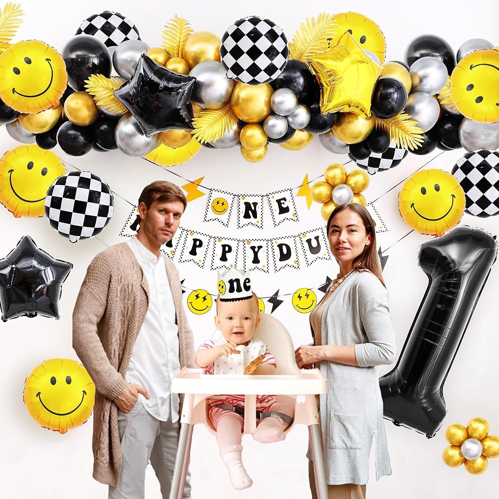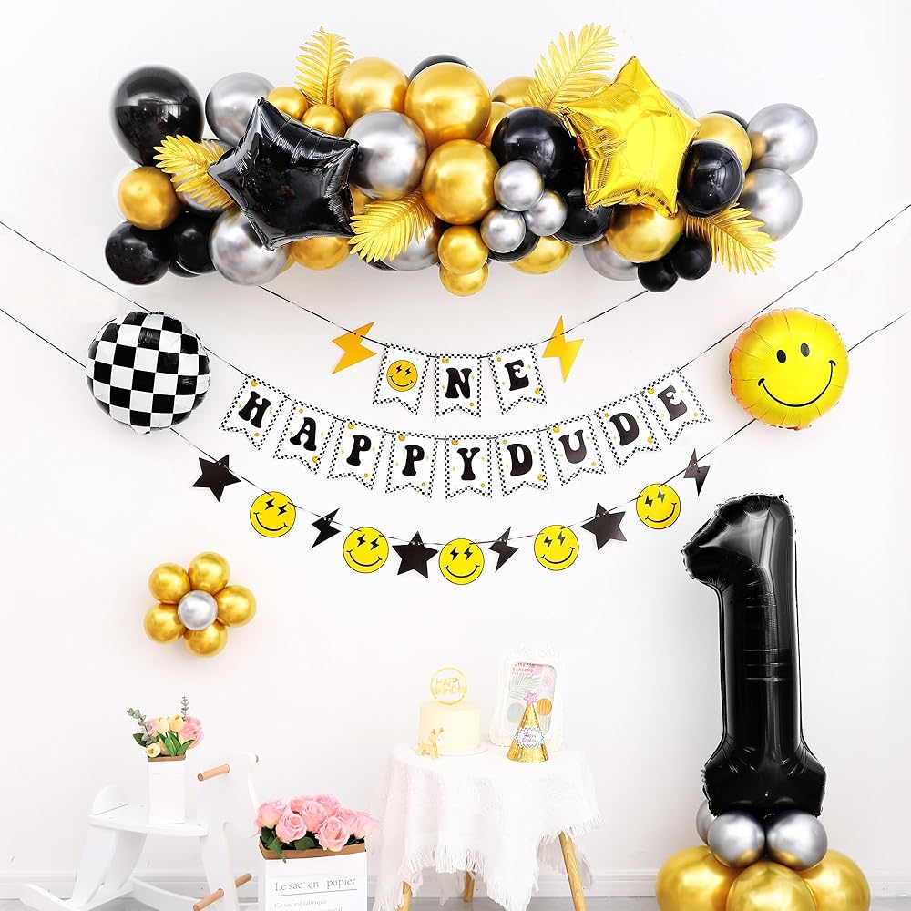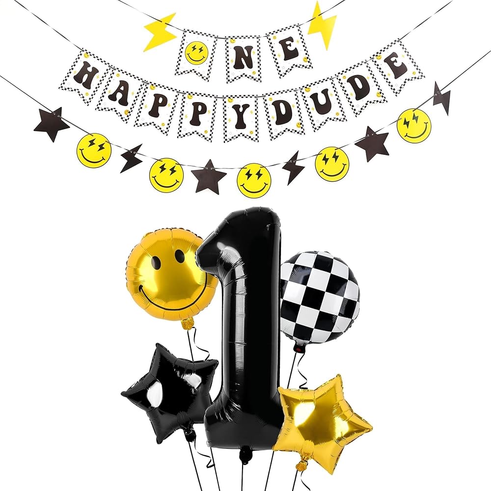 لافتة بعبارة «Happy Dud» ومجموعة بالونات رقم 1 مقاس 40 انش، لعيد الميلاد الأول والوجه المبتسم وزينة حفلات أعياد الميلاد وخلفيات لوازم الحفلات