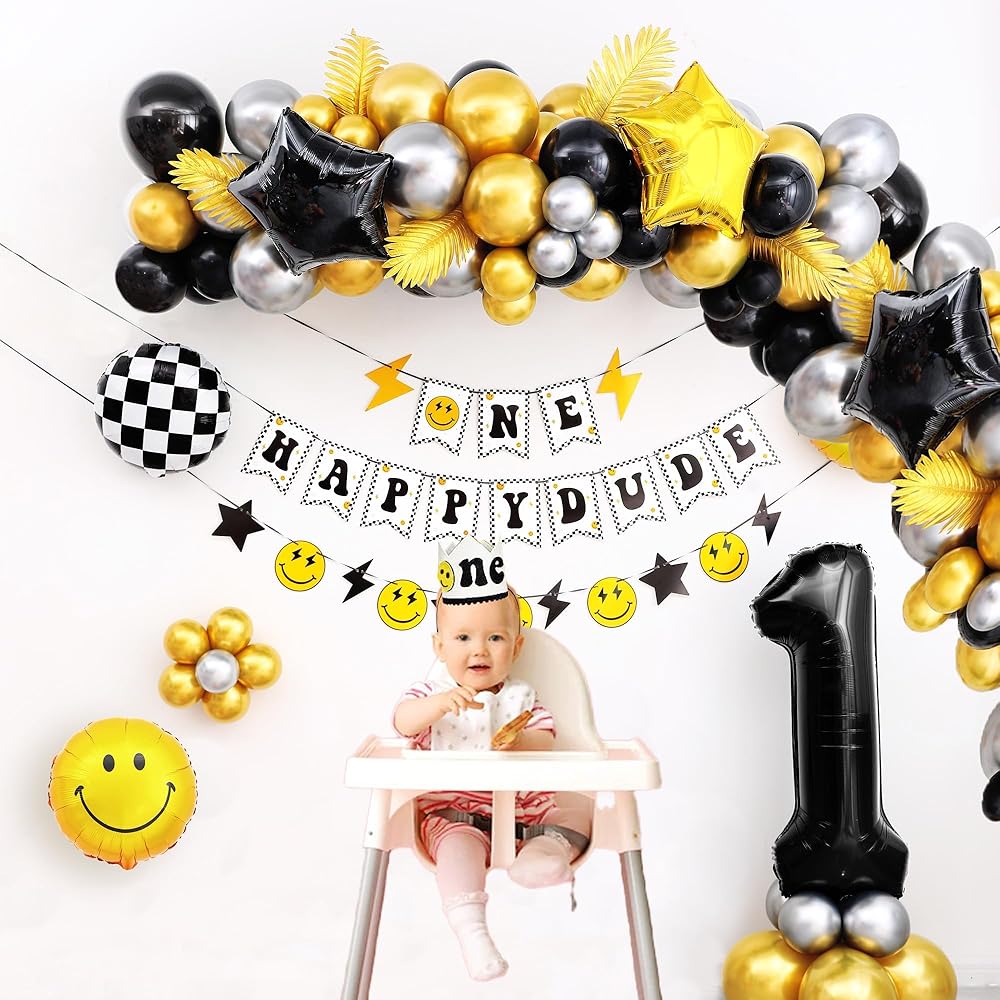 زينة عيد الميلاد الأول بعبارة «Happy Dud»: لافتة واحدة بعبارة «happy dud» × 1، بالون أسود مقاس 40 انش (رقم واحد) × 1، بالون دائري مقاس 18 انش (وجه مبتسم وداق)، 2 × بالون على شكل نجمة مقاس 18 انش (أصفر ذهبي وأسود)