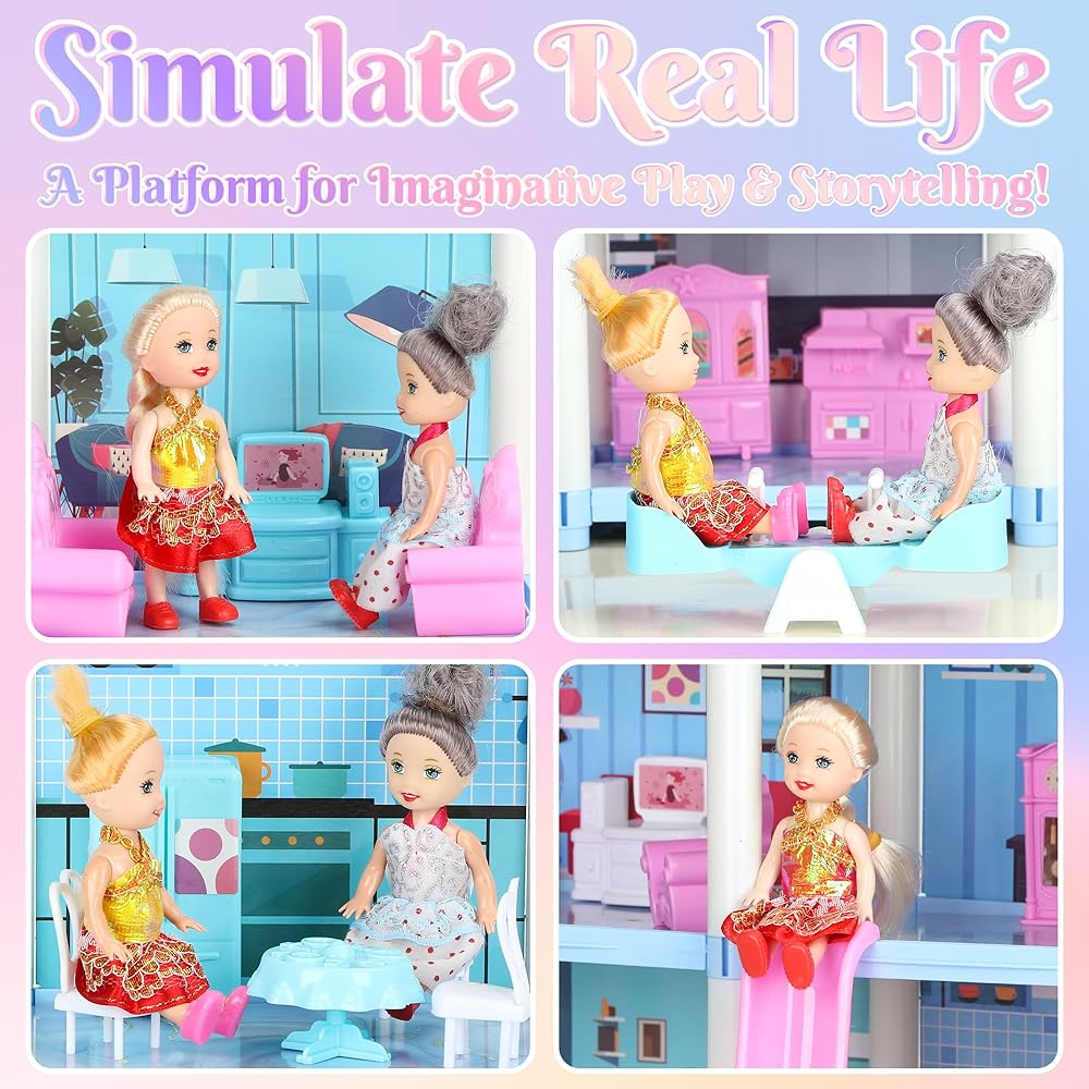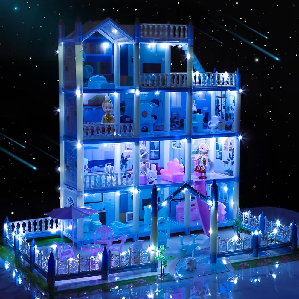 بيت الدمى المكون من 4 قصص من 7 إلى 8 سنوات، بيت الدمى الحلم مع ملحقات الأثاث، 3 دمى، أضواء، بيوت الدمى للأطفال الصغار من عمر 4 إلى 5 سنوات للفتيات والأولاد الذين يتظاهرون كوخ هدية للأطفال بعمر 3 سنوات فما فوق