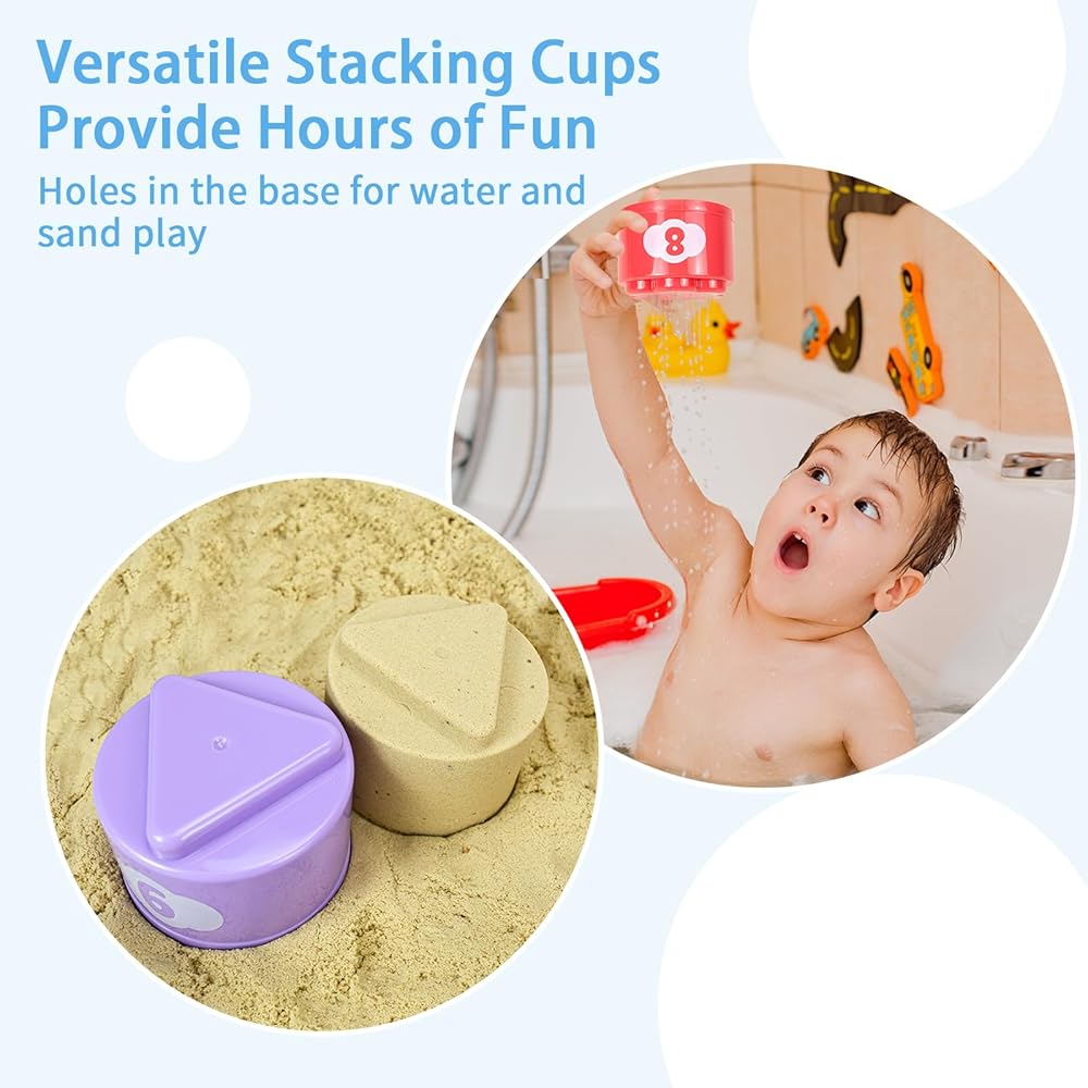 🎉[اجعلها وقت اللعب في أي وقت!]: يمكن استخدام هذه الأكواب الملونة في العديد من أنواع اللعب مثل: التكديس والتعشيش وفرز الأشكال وألعاب الحمام وألعاب الشاطئ والمزيد. قم بتكديسها عاليًا، أو عشها داخل بعضها البعض، أو قم بإسقاطها مرارًا وتكرارًا في الداخل أو الخارج. قم بإنشاء القلاع والأبراج الرملية الأكثر جنونًا على الشاطئ. يمكن للأطفال أيضًا استخدامها للعب في الماء أثناء الاستحمام.
