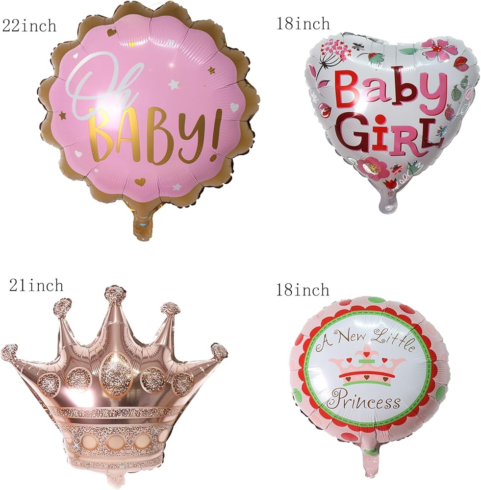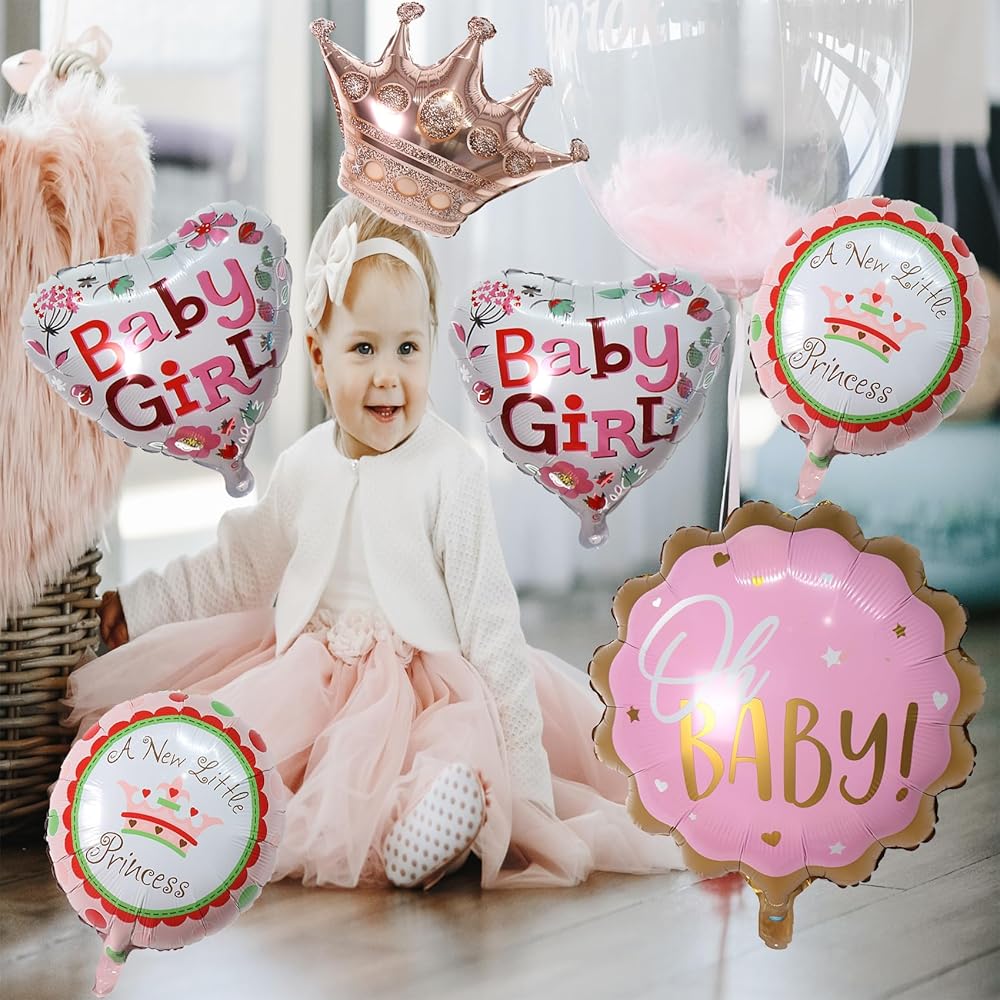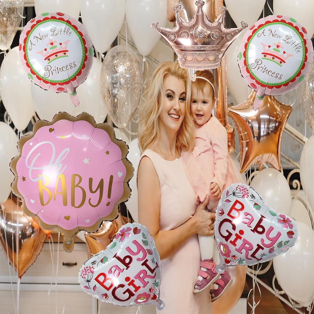 Pink Baby Girl Balloon Set:This baby girl balloon party set including 1 pcs pink oh baby balloon,1 pcs little rose gold crown balloon,2 pcs baby girl heart balloons and 2 pcs pink little circle balloons,they are enough to meet your need to decorate your party for welcoming your little one's arrival.