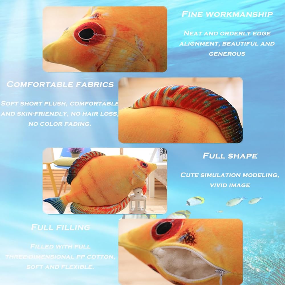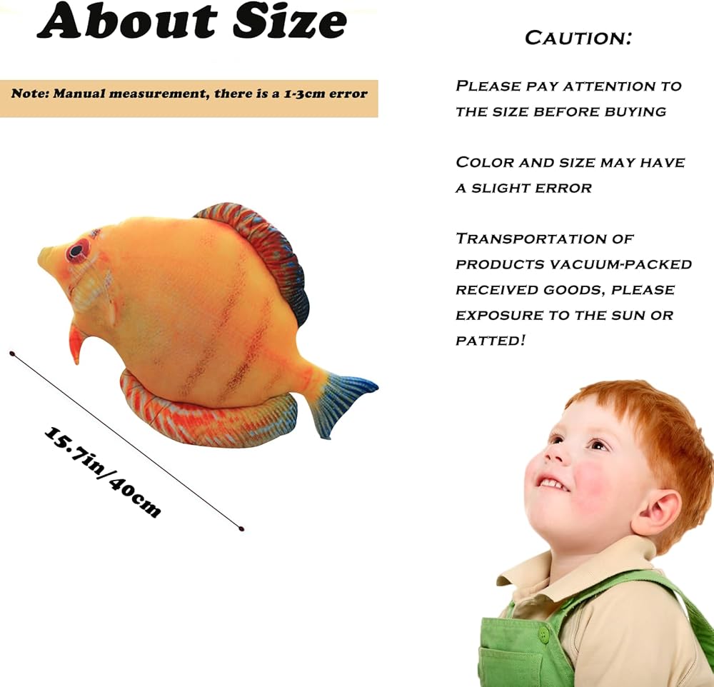 • [مقاس مناسب] - يبلغ حجم هذه الوسادة القطيفة المحشوة على شكل سمكة استوائية حوالي 40 سم/15.7 انش. يتميز وجه السمكة الصفراء بتطريز دقيق للعيون الكبيرة، ويوجد ذيل قصير عريض على شكل مروحة، يبدو حيويًا وجميلًا للغاية، وهي لعبة محشوة ممتعة ومبتكرة يمكنها تلبية احتياجات طفلك.