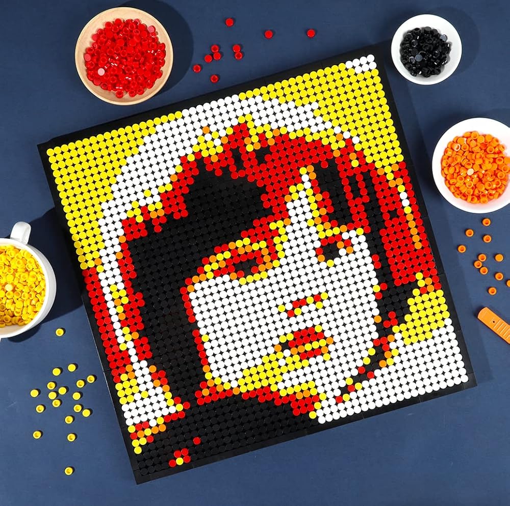 【ما يتضمنه 】 3800 قطعة من الطوب بأربعة ألوان (أبيض: 1350 قطعة، أسود: 1000 قطعة، رمادي: 800 قطعة، رمادي داكن: 650 قطعة)، لوحة قاعدة واحدة مقاس 50 × 50 (15.75 × 15.75 بوصة)، مزيل قرميد واحد لسحب الطوب بعيدًا عن اللوحة الأساسية