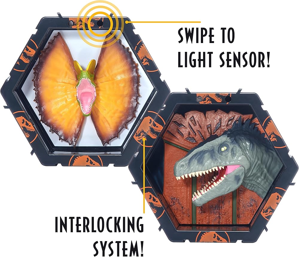 قم ببناء مجموعتك الخاصة - قم بتوصيله بباهر آخر! شخصيات بودز في ثوانٍ. هناك 5 من جوراسيك وورلد واو. البودات التي يجب جمعها: ديلوفوسورس، جيجانوتوسورس، أزرق، ترايسيراتروبس، موساسوروس وتيرانوسورس ريكس. قم ببناء مجموعة الديناصورات بأكملها وشاهدها تضيء الغرفة!