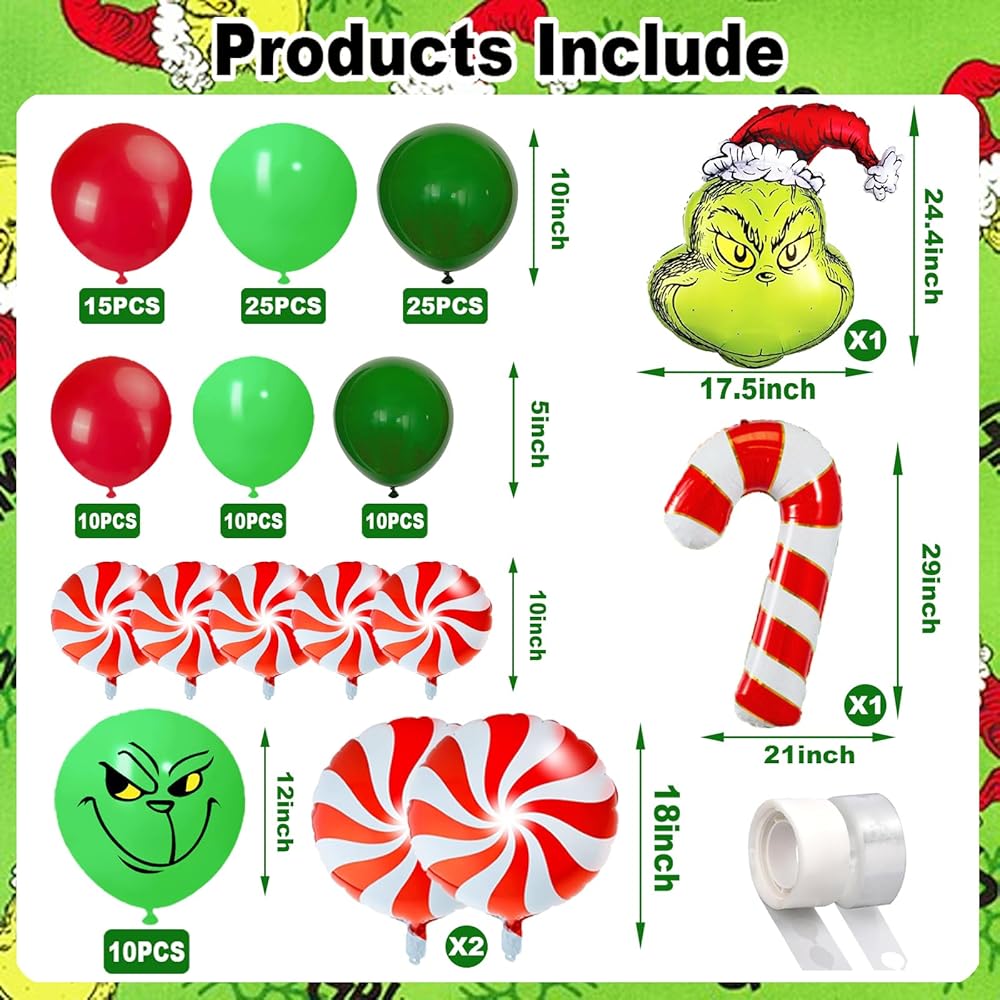 【تشمل العبوة】سوف تحصل على 65 قطعة بالونات مقاس 10 بوصات، و30 قطعة بالونات مقاس 5 بوصات؛ 10 قطع بالون أخضر مقاس 30.48 سم؛ 8 قطع من بالونات مايلر من رقائق قصب حلوى عيد الميلاد؛ قطعة واحدة من بالونات الفويل. 1 سلسلة بالون و100 نقطة صمغ. لوازم الحفلات المثالية يمكن أن تضيف المرح إلى ديكورات أعياد ميلاد الأطفال