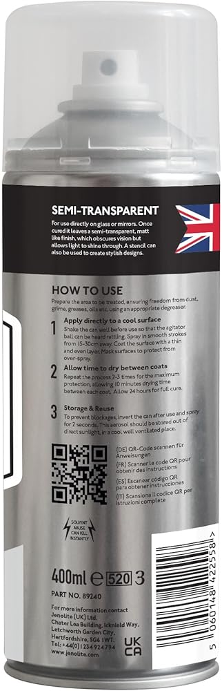 JENOLITE Frosted glass paint leaves a semi-transparent, matt like finish, which is perfect for decoration or indeed providing privacy to your home. Suitable for interior use, this fast drying paint is ideal for use on skylights, glass doors, windows and mirrors.