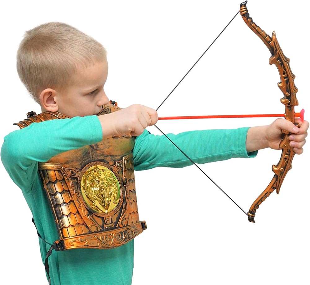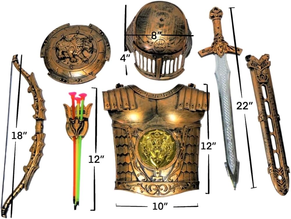 مجموعة كاملة: تحتوي مجموعة أزياء الفارس المكونة من 7 قطع على خوذة ودرع وغمد ودرع وفيونكة مع 3 أسهم وجعبة مشبك. مجموعة الألعاب المصممة بشكل مذهل ستجعل أطفالك معجبين حقًا.