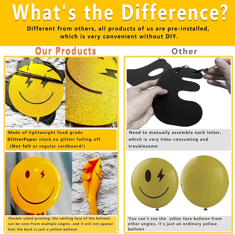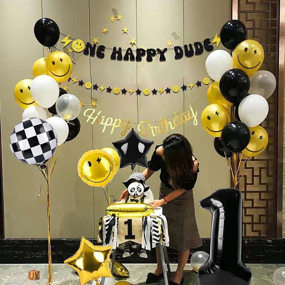 【What You Will Get】Pre-Strung 2pcs One Happy Dude Banner, 1pcs cake topper, 5PCS AluminumFoil Balloons, 12pcs yellow face balloons, 12pcs black balloons.