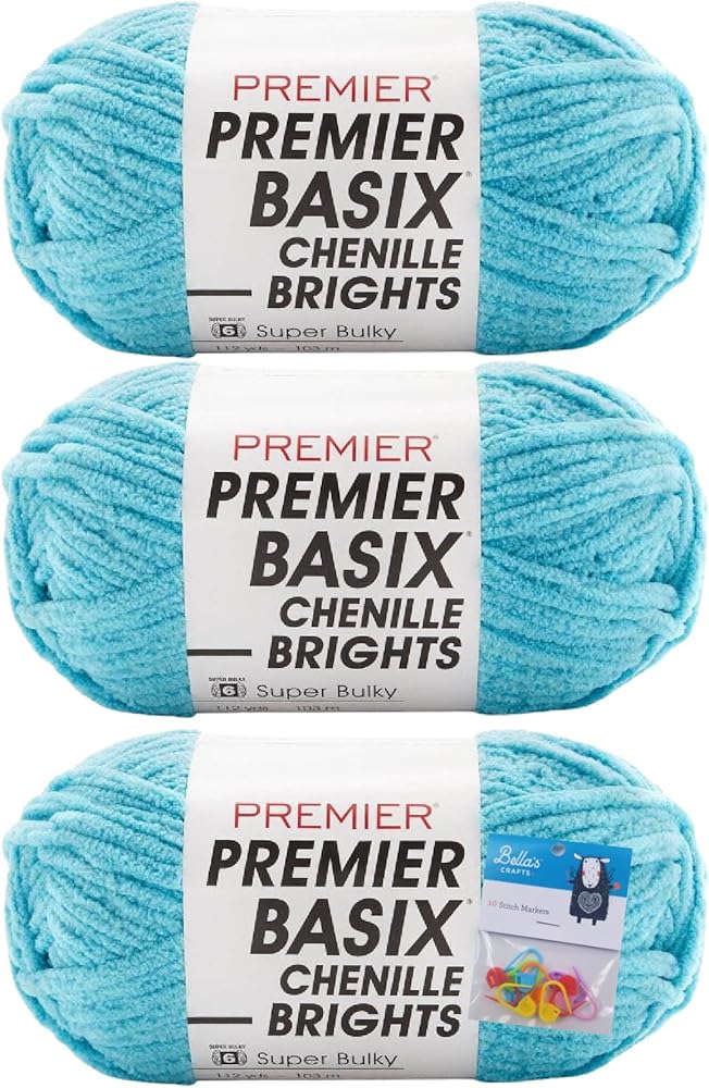 Premier Yarns Basix Chenille Brights 3-Pack Yarn Bundle With Bella's Crafts Stitch Markers,.