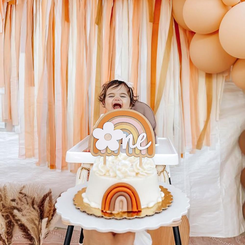 THE BEST BIRTHDAY PARTY DECORATION PROPS - The orange retro daisy cake with this flower one topper looks so cute, it will definitely make the guests unable to resist taking pictures of the cute baby and the birthday cake.