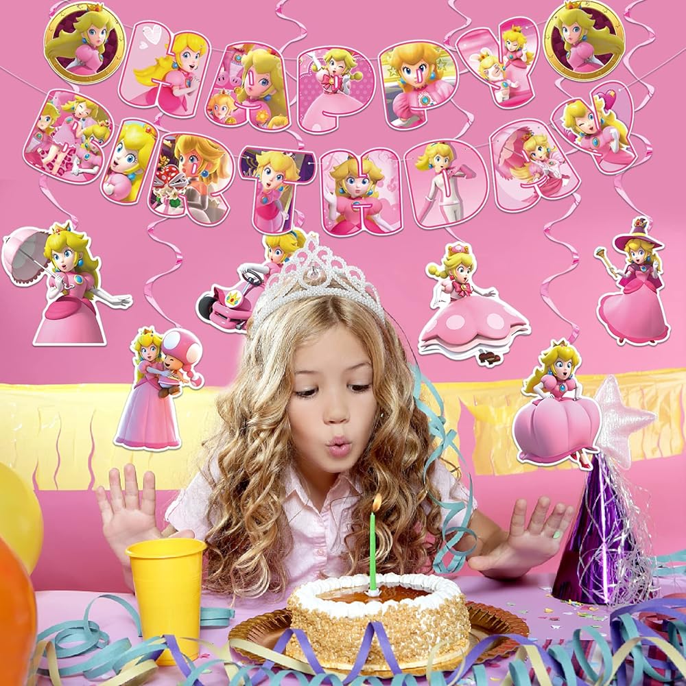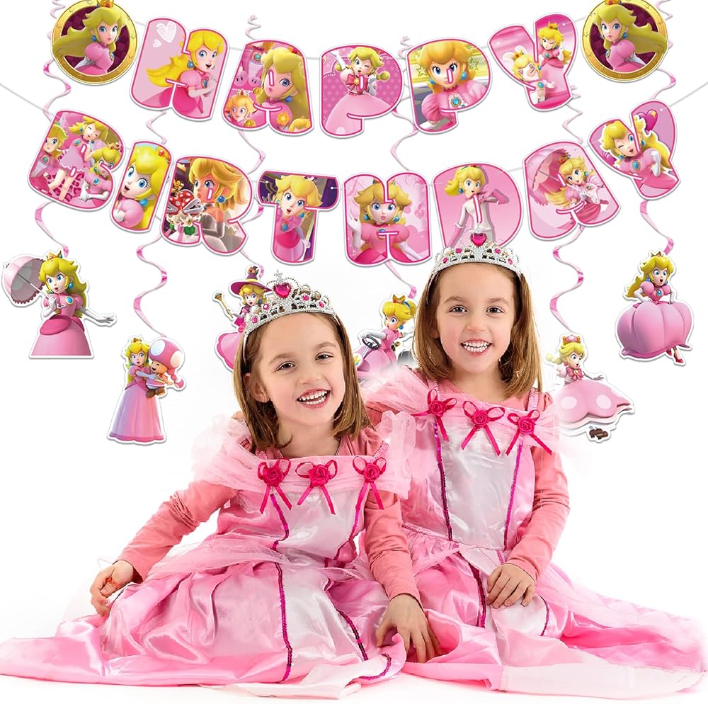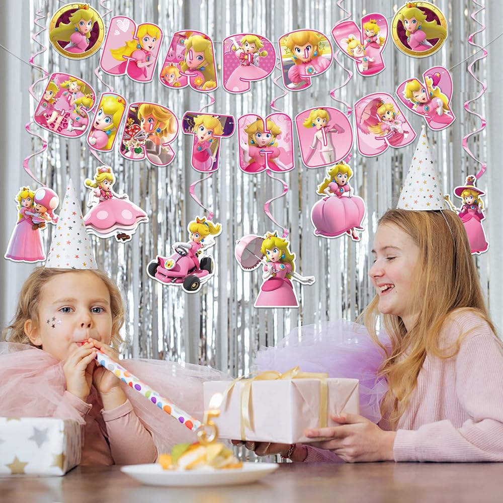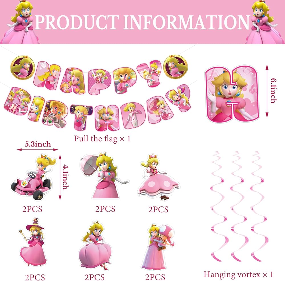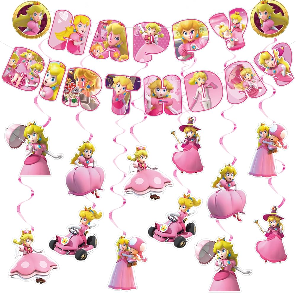 · لوازم حفلات الأميرة الخوخ: اللافتة ذات الألوان الزاهية والدوامة المعلقة المثالية ستخلق نجاحًا كبيرًا ومتعة رائعة لحفلات عيد ميلاد الأميرة الخوخ. أنماط ملونة تمنح حفلتك تأثيرًا مشرقًا، استمتع!