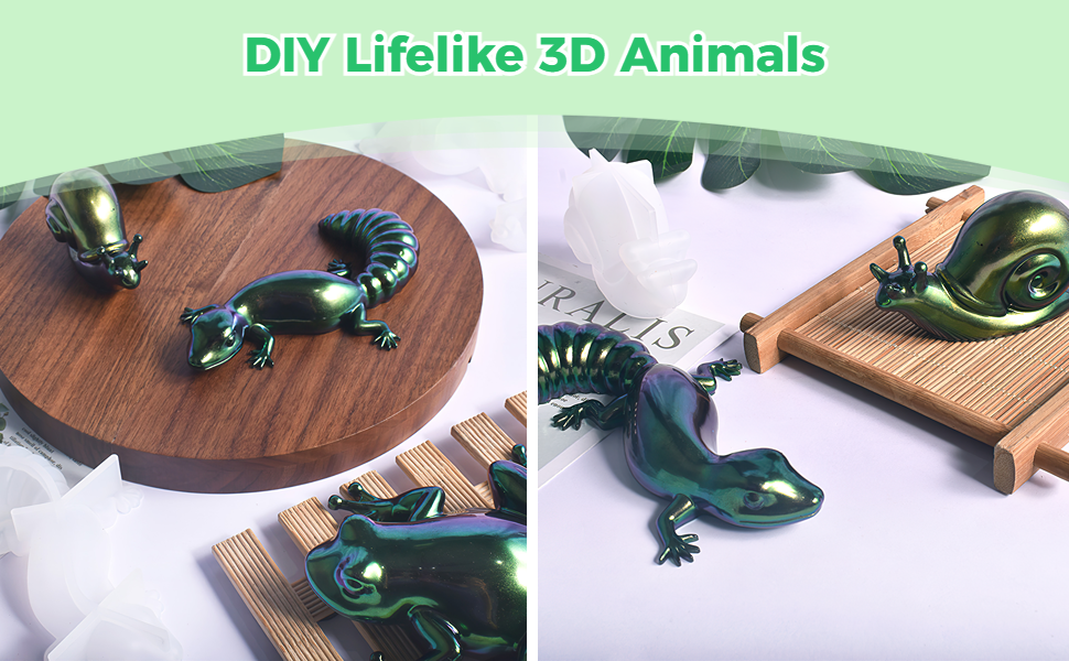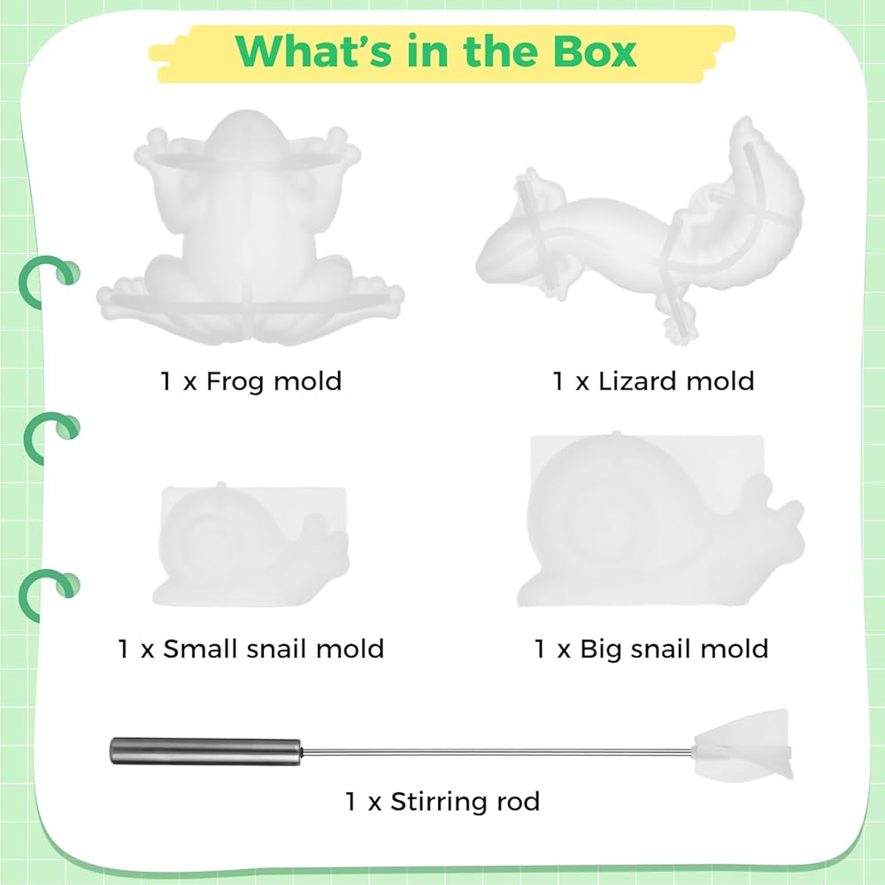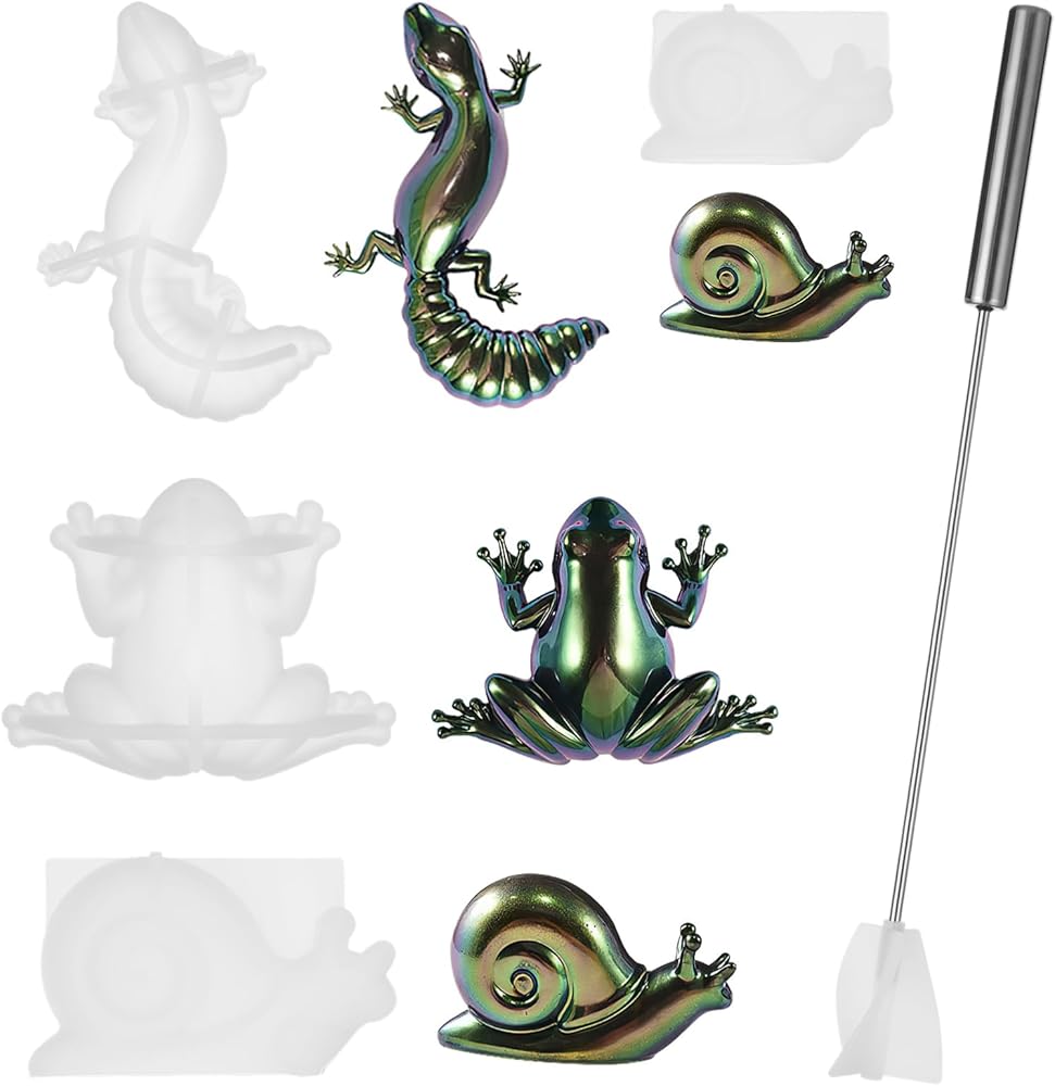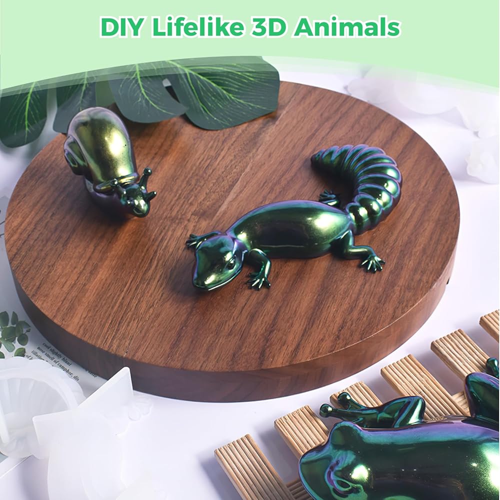 جويبي 4 قطع من قوالب راتنج الايبوكسي على شكل حيوانات، مجموعة قوالب سيليكون على شكل حيوانات الزواحف مع خلاط الراتنج، قوالب حيوانات ثلاثية الابعاد نابضة بالحياة للضفادع والسحلية والحلزون والحرف اليدوية