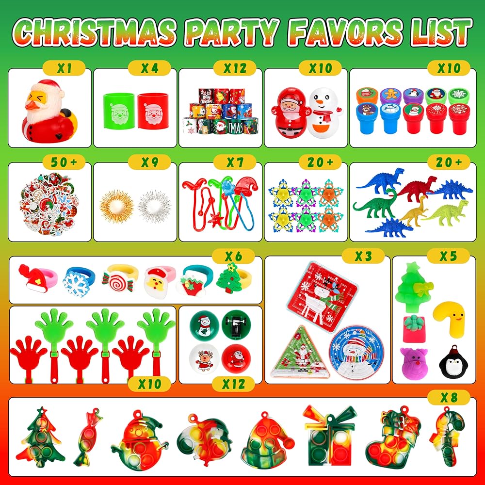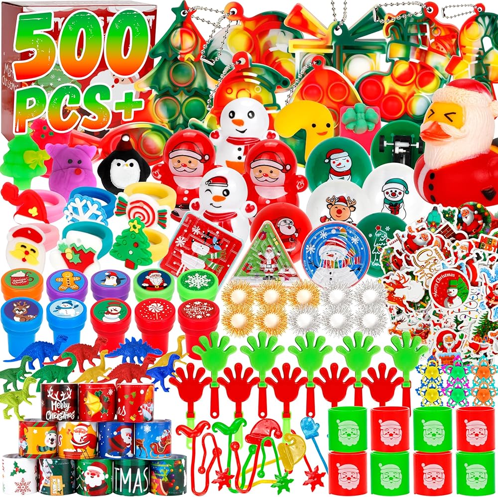 Total 500+ Pcs Party Favor Assortment: pop fidget toys, mochi squishies, fidget cube, pullback cars, pullback plane, mini top toys, bouncing frog, sticky hands, brain teaser puzzle boxes, maze puzzles, slap bracelet, splice ball, blowouts,mini dinosaurs,rainbow circles, skateboards, cute tumblers, spinner soccer balls, shooting balls, bouncing man, cartoon car,3D stickers,and so on.