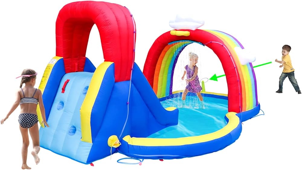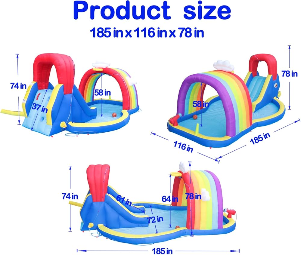 العناصر المميزة: شرائح كاملة بمتعة الأطفال، الرش قوس قزح، حافة كرة السلة، جدار التسلق، مدفع ماء، لعبة حلقة قابلة للنفخ وحمام التجديف كبير الحجم للأطفال للاستمتاع بالترفيه واللعب. الشرائح التي تؤدي إلى حمام سباحة مجوف ولكن كبير الحجم من أجل هبوط رذاذ كبير. لعبة مدفع المياه وإطارات كرة السلة تأخذ المزيد من الخيارات للأنشطة للأطفال. سيتعلم أطفالك كيفية مشاركتهم مع الآخرين أثناء التمرين واللعب.