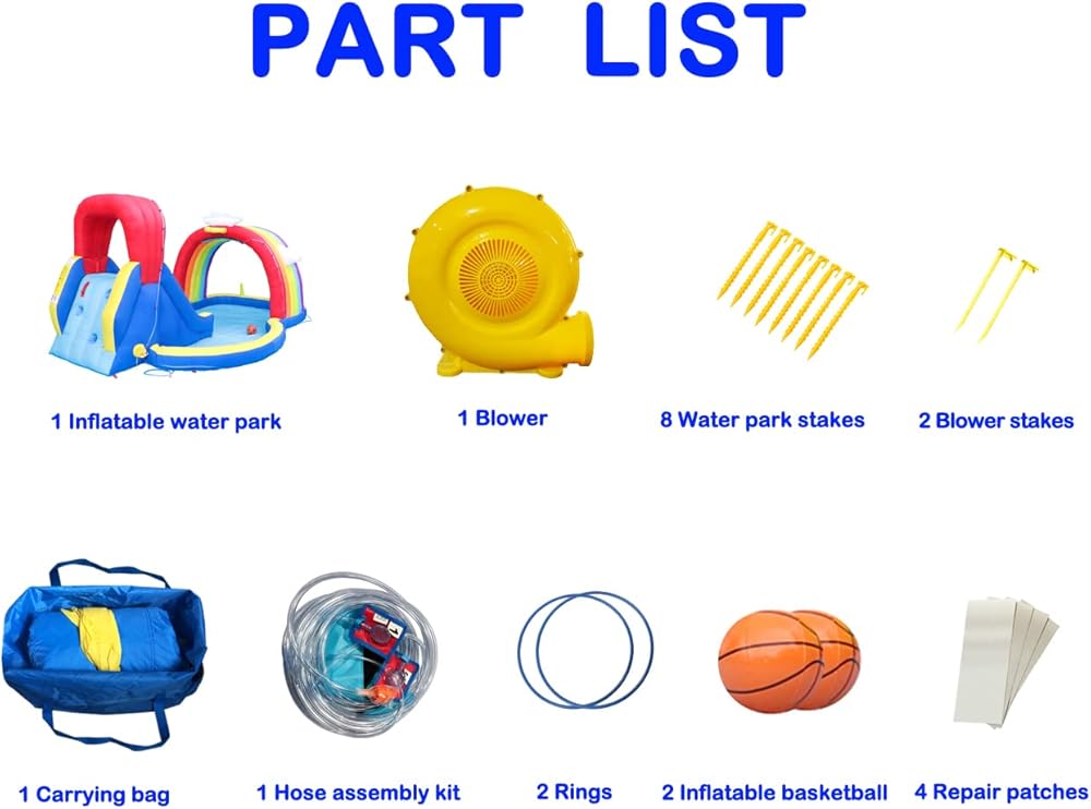 الملحقات والمكملات السعيدة: هناك مجموعة غنية من الملحقات هنا، وتشمل منفاخ، و2 أوتاد منفاخة، و8 أوتاد للحديقة المائية، و4 رقع إصلاح، و1 مجموعة تجميع خراطيم، وحلقتين، وكرة سلة قابلة للنفخ وحقيبة حمل. هذه الحديقة المائية القابلة للنفخ مثالية للهدايا والعطلات. عندما يشعر الطفل مقيد، فإن هذه القلعة القابلة للنفخ متعددة الوظائف مع مزيج منزلق سيرافقهم ويقضي على مشاعرهم السيئة ويعطي الأطفال بيئة نمو صحية.