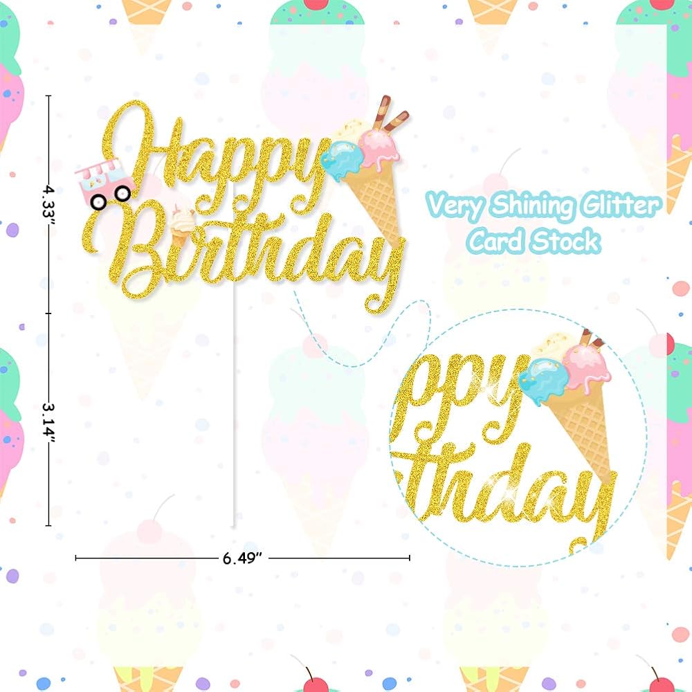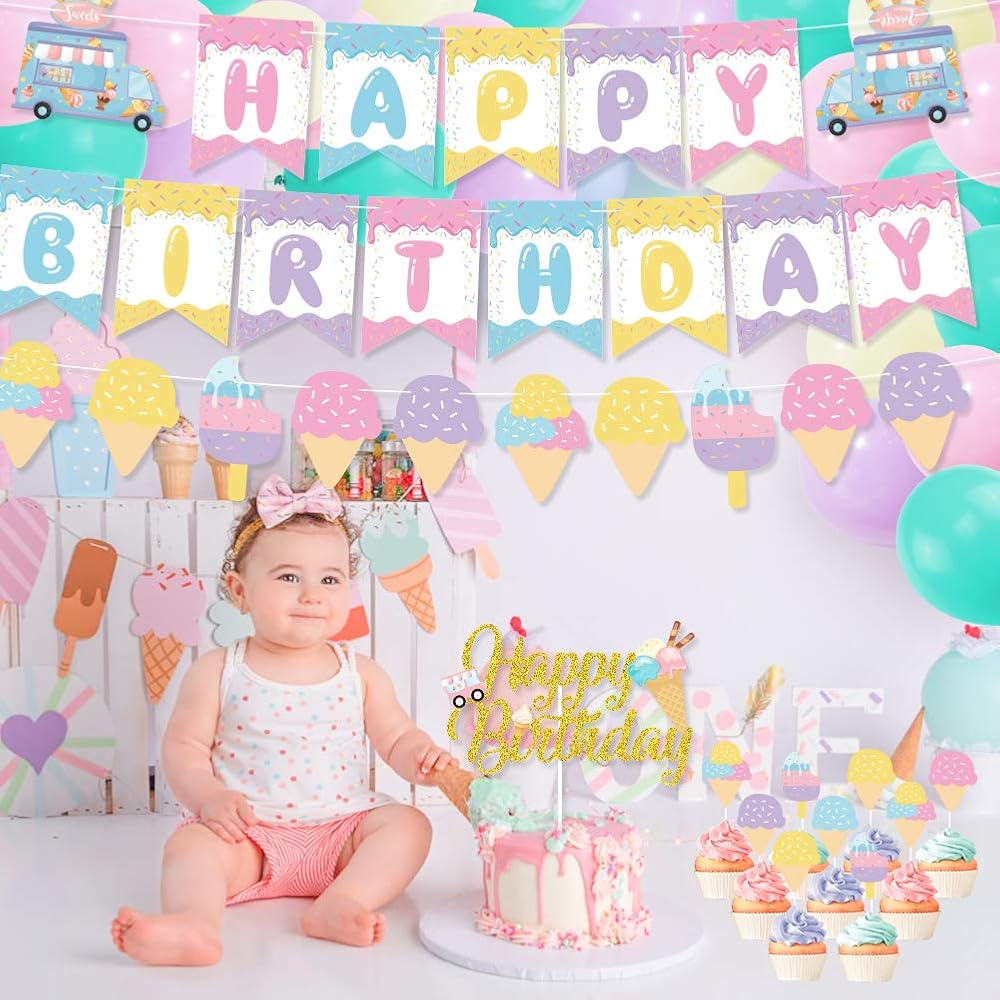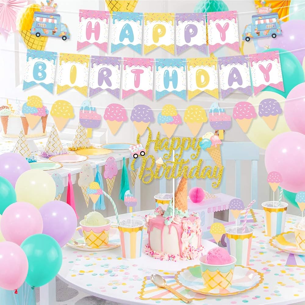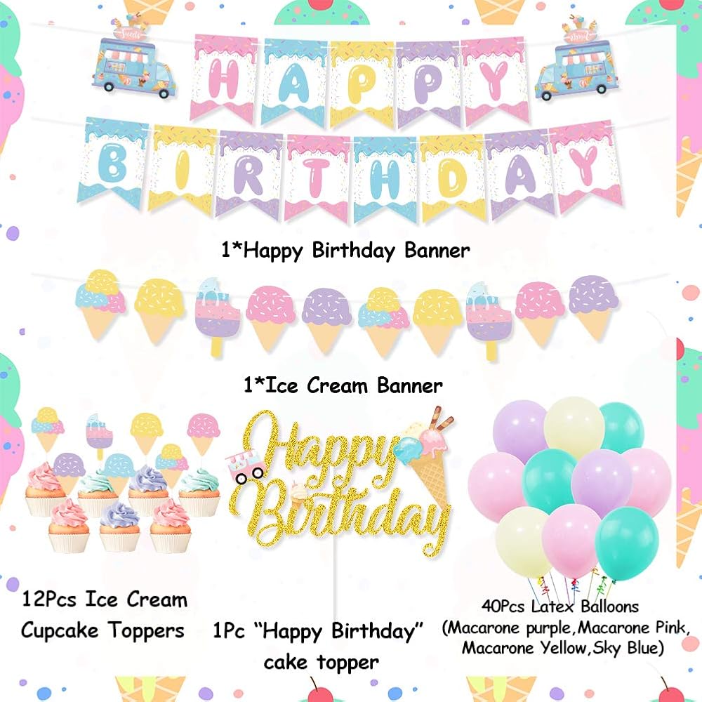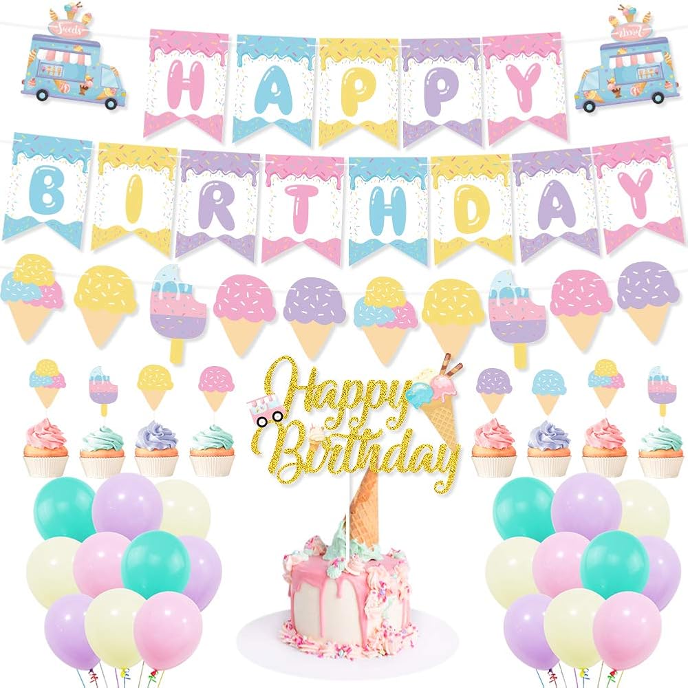 زينة حفلات اعياد الميلاد بتصميم ايس كريم، لافتة عيد ميلاد سعيد لتزيين الكيك والكب كيك وبالون ماكرون للبنات في الصيف وحفلات اعياد الميلاد وحفلات استقبال المولود الجديد