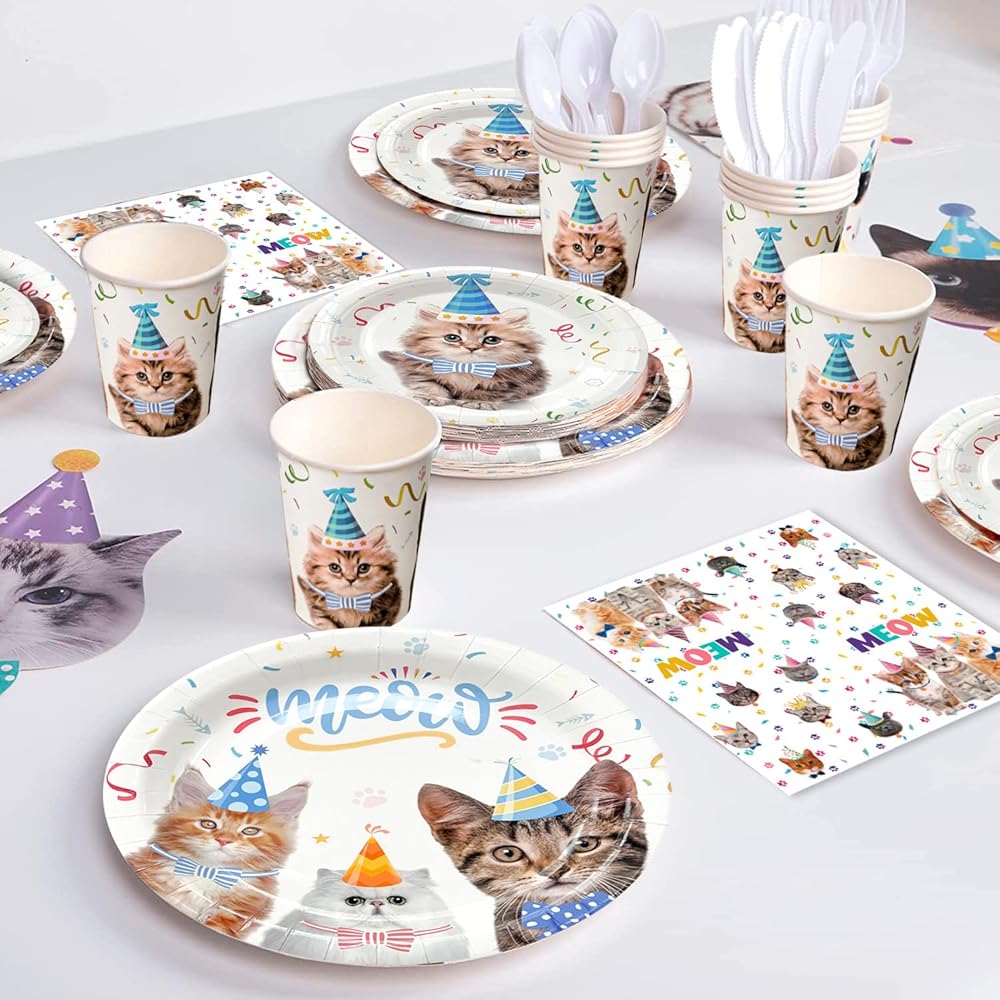 لوازم حفلات اعياد الميلاد على شكل قطة، 167 قطعة من ديكورات عيد ميلاد القطط ومجموعة ادوات المائدة بطابع القطط، اطباق ومناديل حفلات الخ، لوازم حفلات اعياد الميلاد بطابع القط