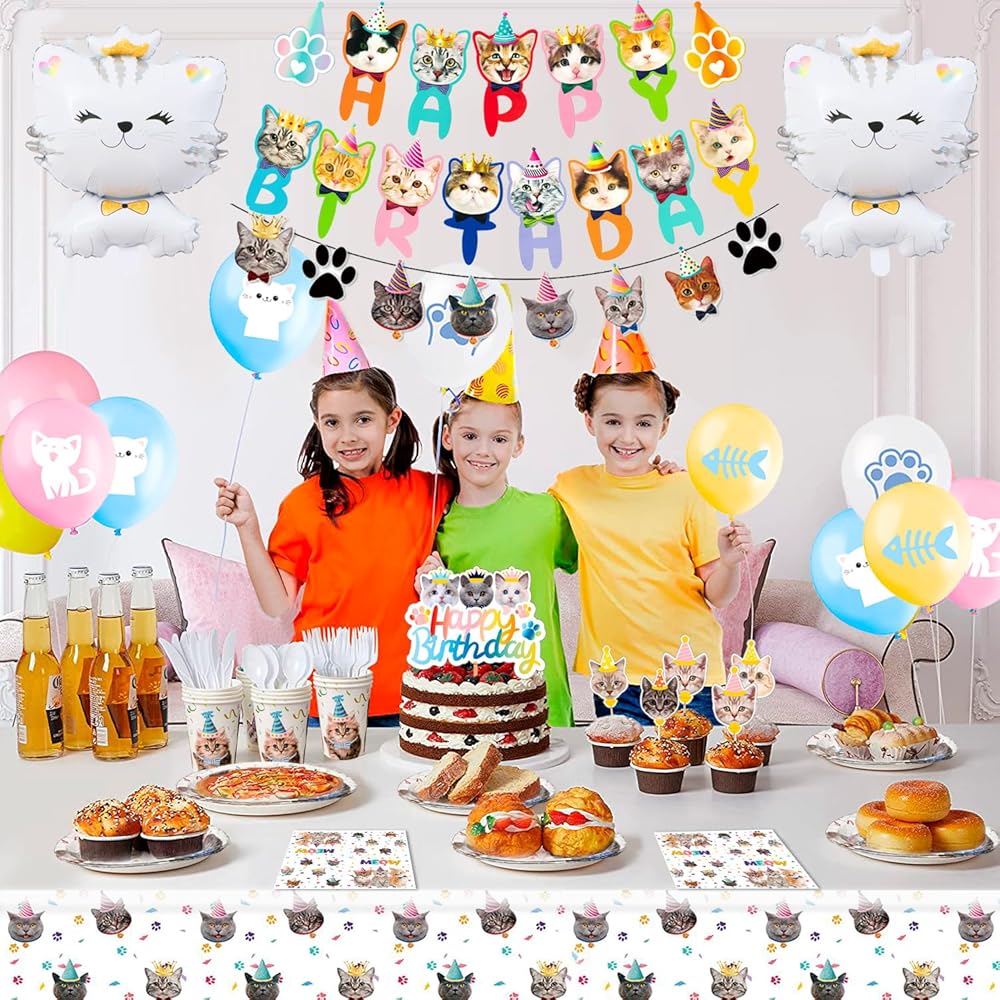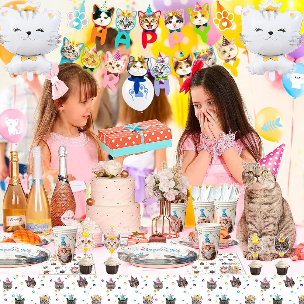 لوازم حفلات أعياد الميلاد على شكل قطة، 167 قطعة من ديكورات عيد ميلاد القطط ومجموعة أدوات المائدة بطابع القط - أطباق حفلات القطط والمناديل ومفرش المائدة ولافتة عيد ميلاد القطط وغيرها من لوازم حفلات أعياد الميلاد للفتيات