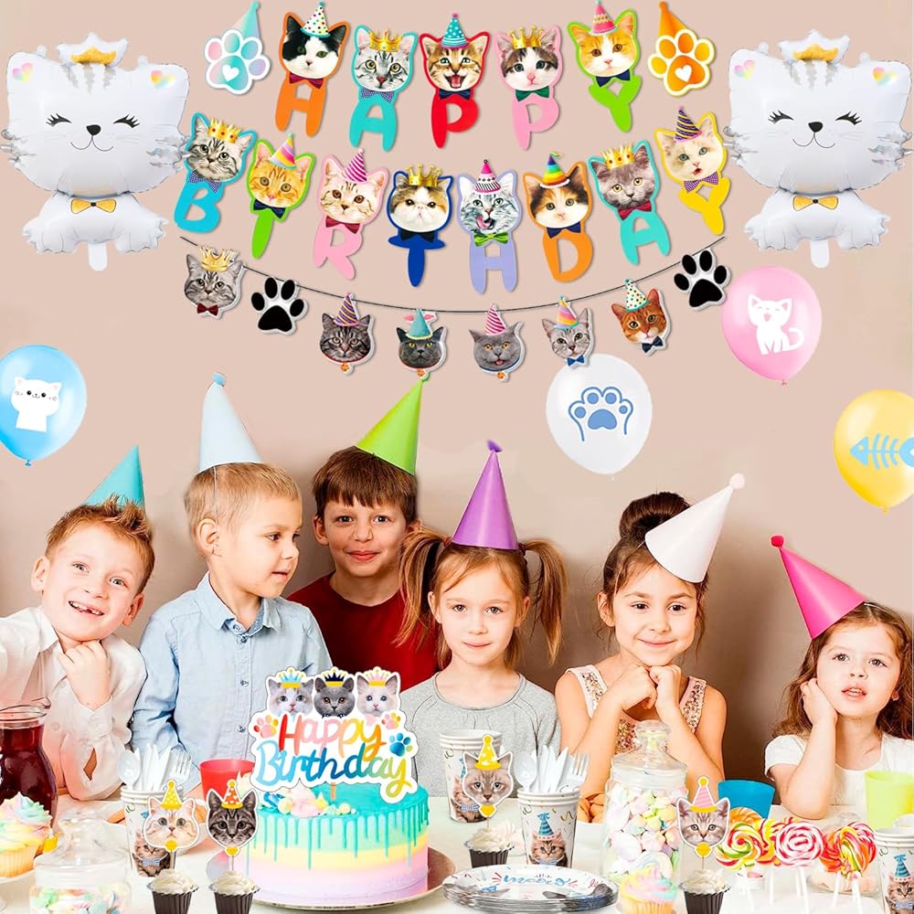 🐾تصميم فريد🐾 تم تصميم ديكورات حفلات أعياد الميلاد بنمط قطة بأنماط أنيقة وألوان ملونة، مما يخلق جوًا دافئًا لحفلة عيد ميلاد قطتك.