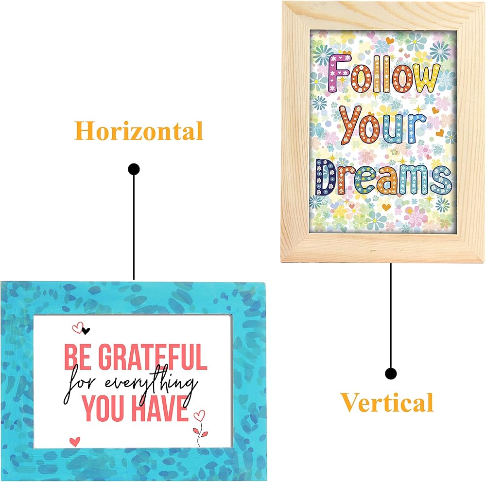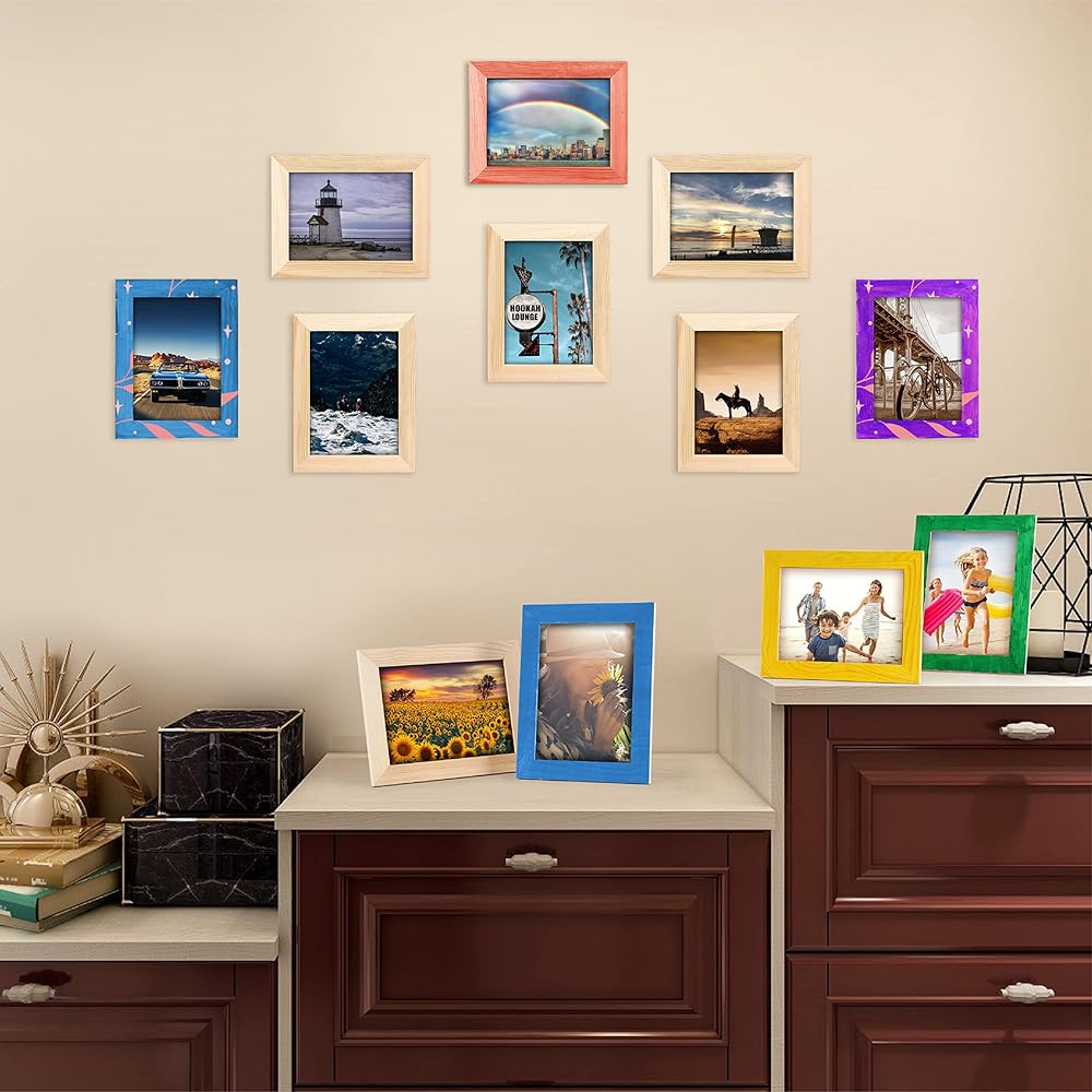 جودة عالية - إطارات الصور الـ 12 هذه مصنوعة من خشب الصنوبر الصلب، ويمكن أن تقف في كل من الأوضاع الرأسية والمناظر الطبيعية مع الأوتاد القائمة المتضمنة، أو يمكن تعليقها على الحائط. الإطار الفعلي 7 × 9 انش ويحمل صور 5 × 7