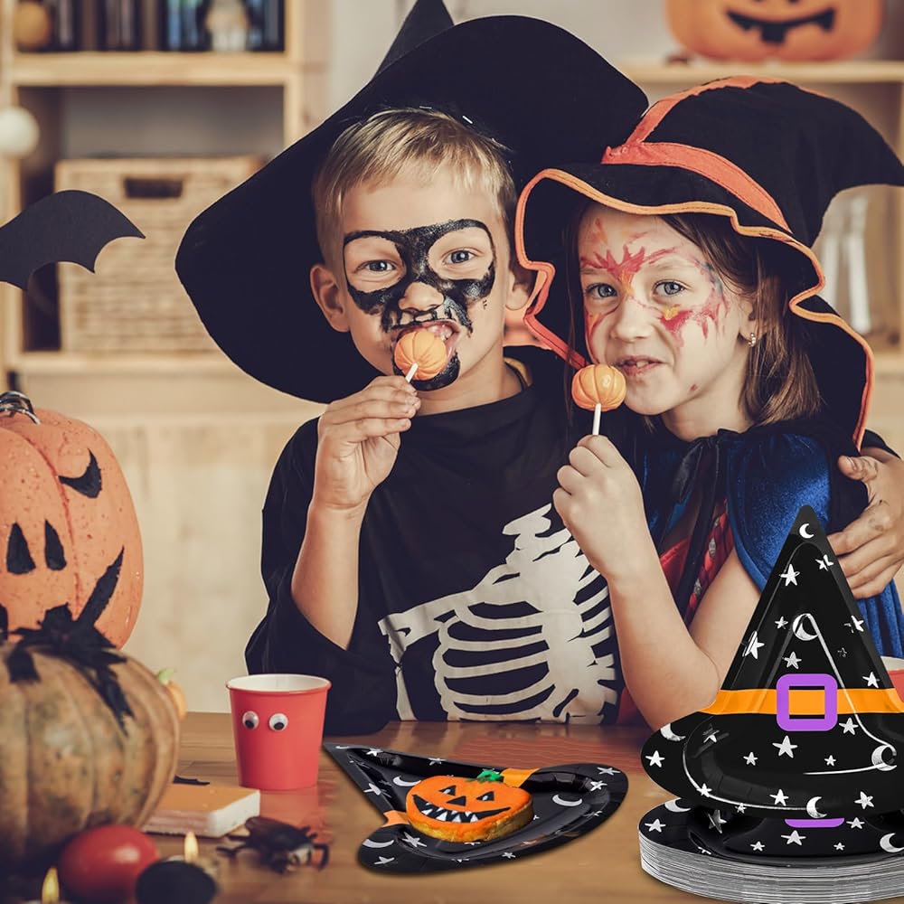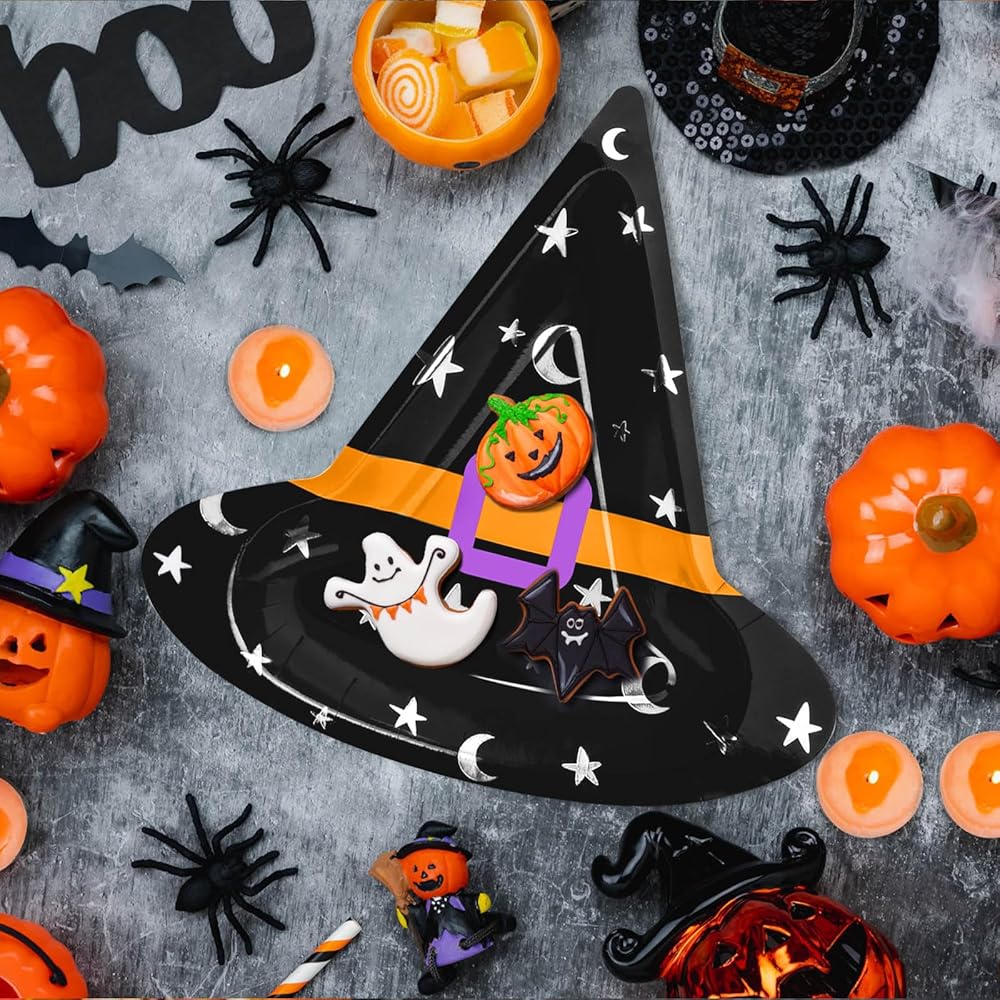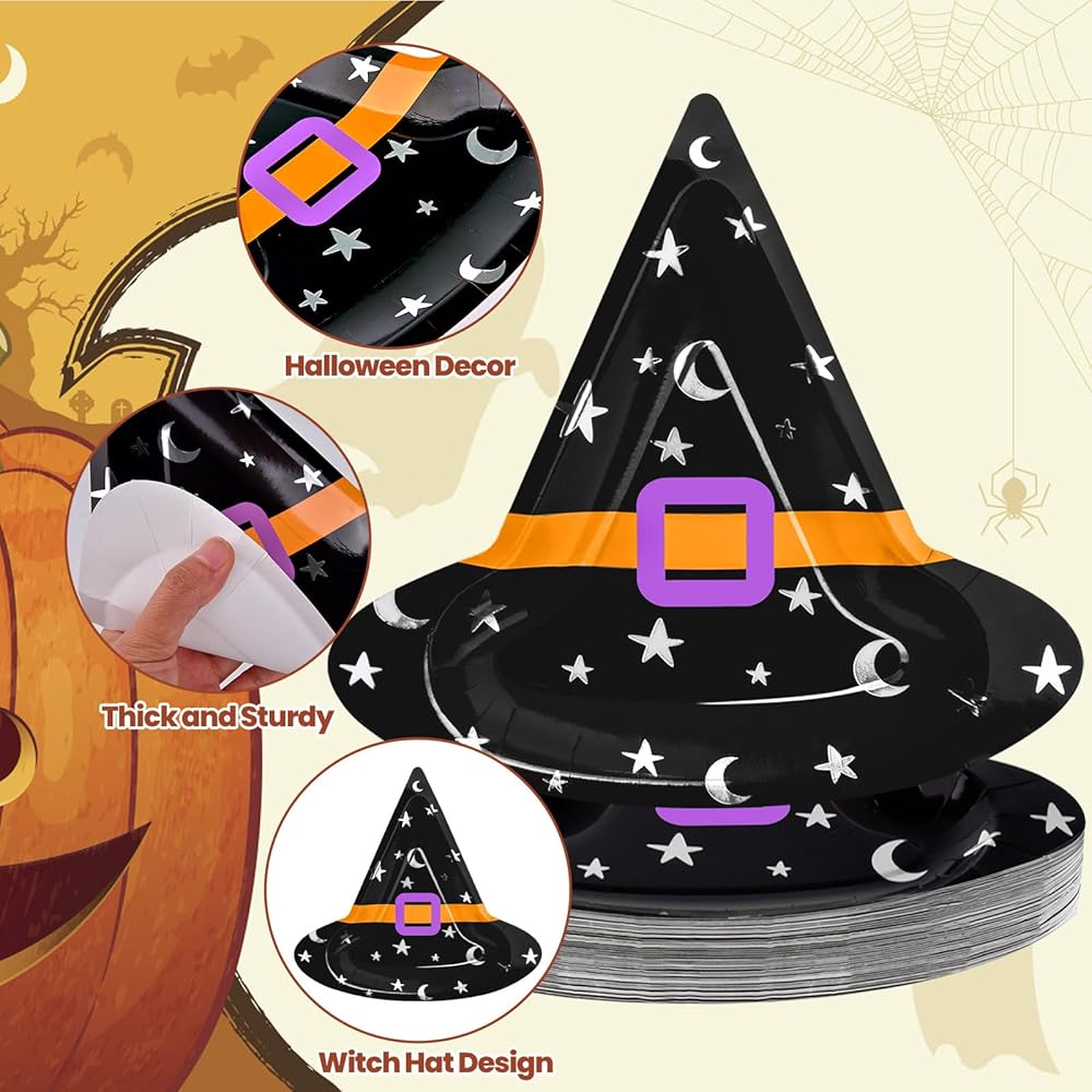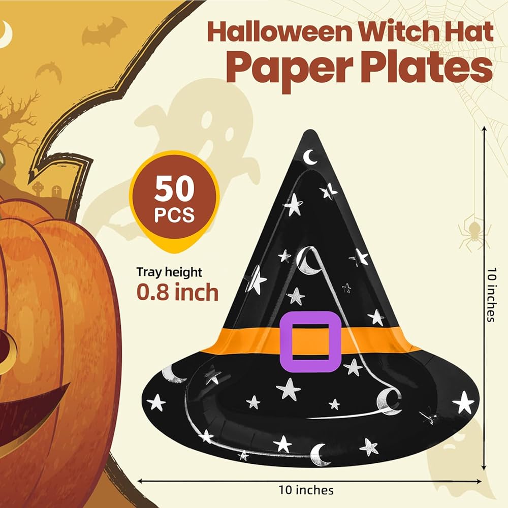 ما تحصل عليه: تأتي العبوة مع 50 قطعة من الأطباق الورقية لحفلات الهالوين؛ كمية كافية ونمط قبعة الساحرة لإرضاء ديكورات حفلات الهالوين الخاصة بك