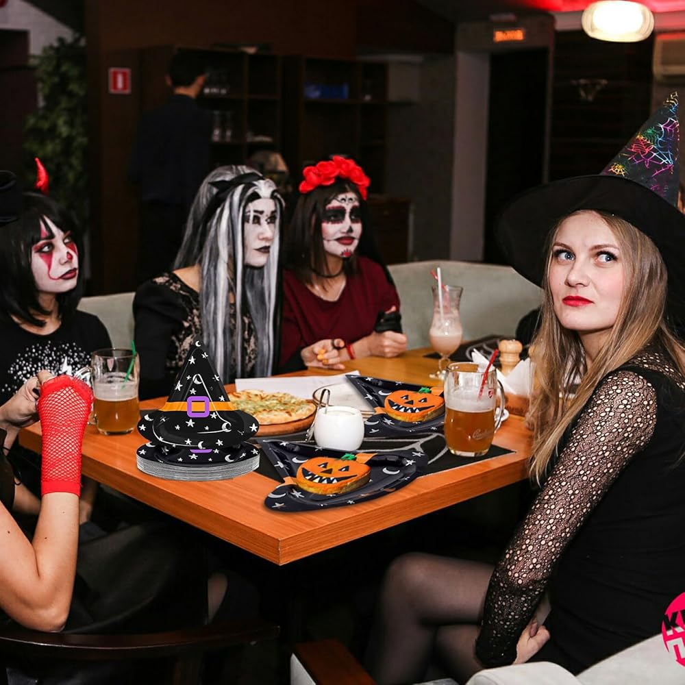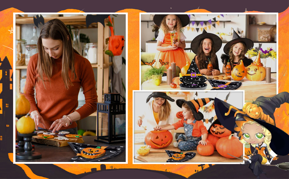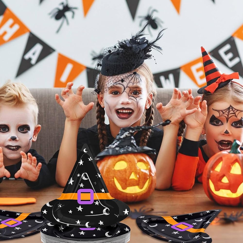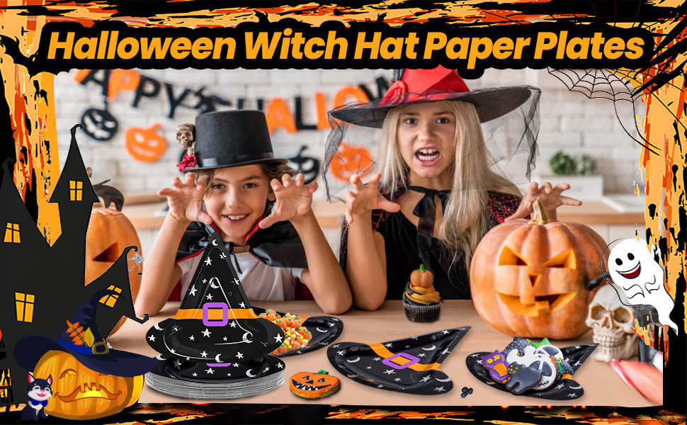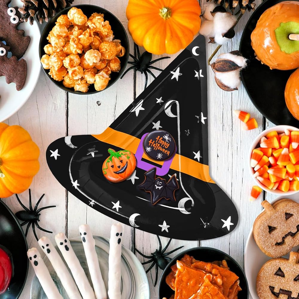 ما تحصل عليه: تأتي العبوة مع 50 قطعة من الأطباق الورقية لحفلات الهالوين؛ كمية كافية ونمط قبعة الساحرة لإرضاء ديكورات حفلات الهالوين الخاصة بك
