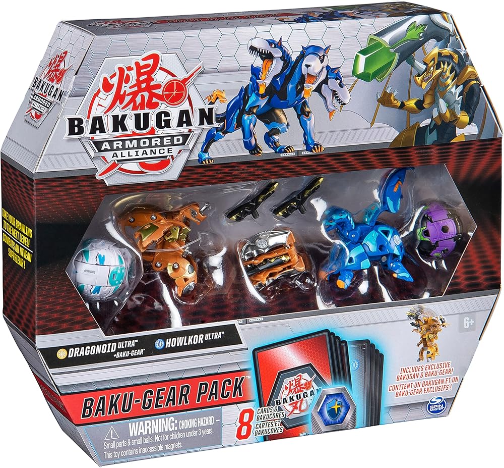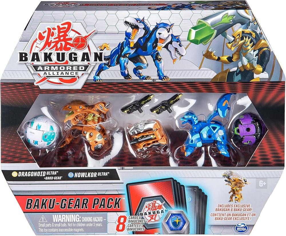 Take your brawling to the next level with the Bakugan Baku-Gear Pack! Start or add to your Bakugan collection with an exclusive Bakugan Ultra with Baku-Gear, a Bakugan Ultra, two Bakugan, eight BakuCores and collectible character cards and ability cards! With everything you need included, roll into action straight out of the box. Unleash the power of your Armored Alliance Bakugan by rolling them over the included BakuCores for pop open Baku-Action or use your Bakugan Ultra's for epic leap open transformation! Amp up your battling power by dropping the Baku-Gear on top of your exclusive Bakugan Ultra and watch it transform! Ready to brawl? Enter battle with the Baku-Gear Pack's mega-powerful creatures and gear and use the character and ability cards (included) optimized for your Bakugan action figures, to defeat your opponent! Look for all of the Baku-Gear Packs to add all of the exclusive characters and Baku-Gear to your collection (each sold separately)! No battle will ever be the same with Bakugan and the Baku-Gear Pack!