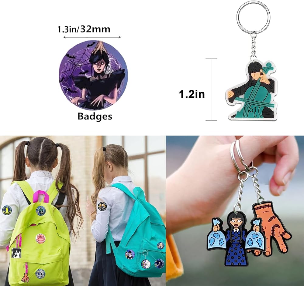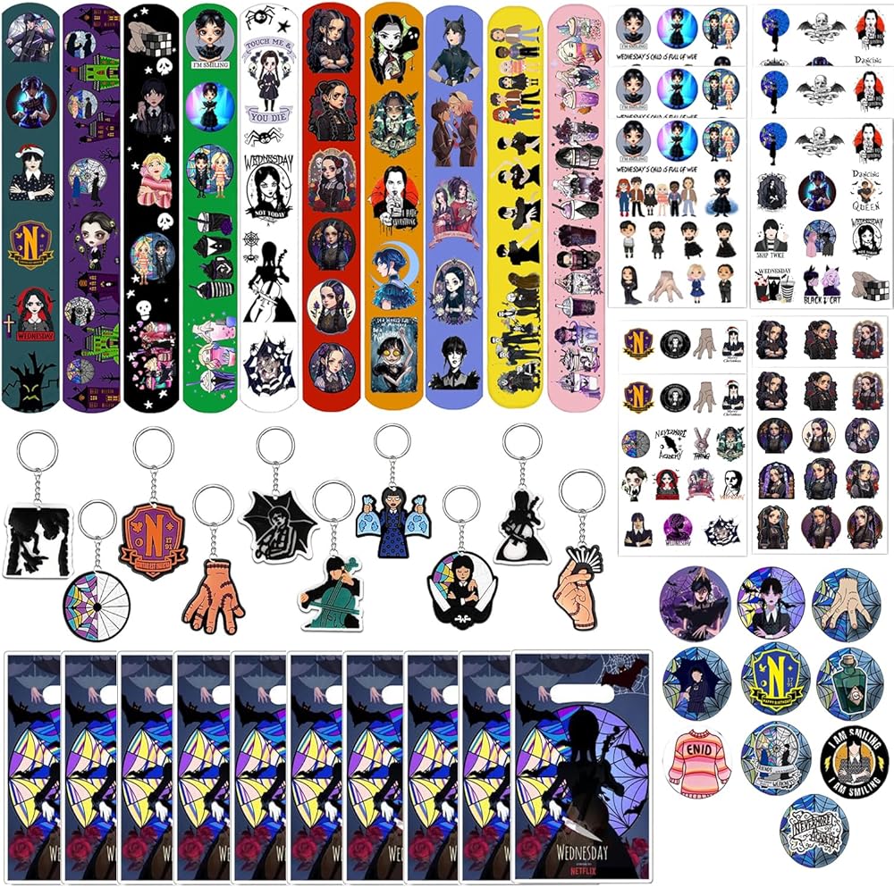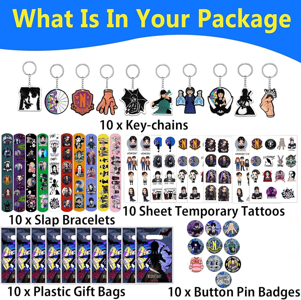 عبوة اقتصادية - تحتوي لوازم الحفلات ذات الطابع الخاص للفتيات على 10 قطع من حقائب الحلوى، 10 قطع من حلقات المفاتيح الرائعة، 10 قطع من أساور المعصم، 10 قطع من الشارات، 10 أوراق ملصقات تاتو مؤقتة. لوازم حفلات رائعة على شكل نجمة لملء أكياس هدايا عيد الميلاد.