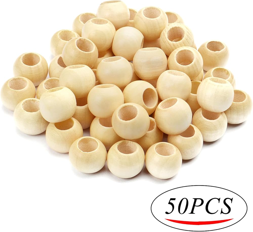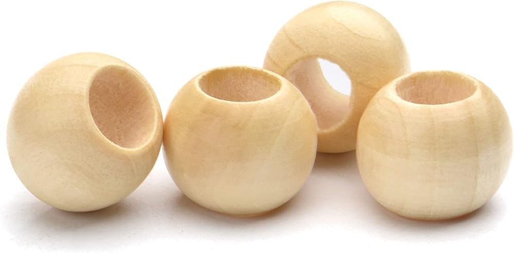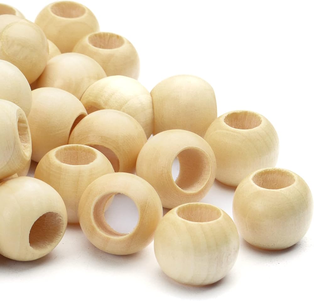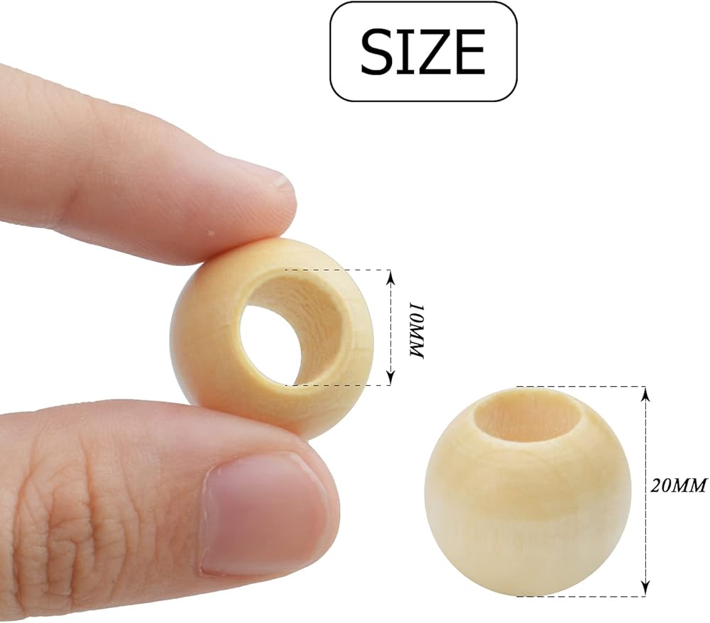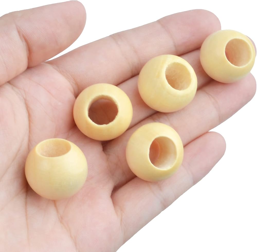 • خرز خشبي كبير: يبلغ قطر هذه الخرزات الخشبية المستديرة تقريبًا 20 ملم، مع فتحة 10 ملم، كبيرة بما يكفي حتى للجرافات السميكة أو الجلود.