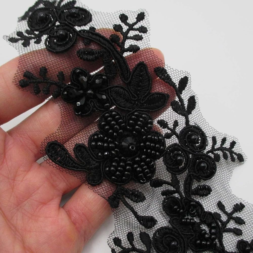 This unique appliques have beautiful rayon embroidered floral pattern with crystals, sequins and beads. The applique is made on a mesh backing for easy stitching. Very well made. It can easily be hand-stitched onto garments, accessories and more. Each piece of applique measures 3 1/2" X 11 3/8".