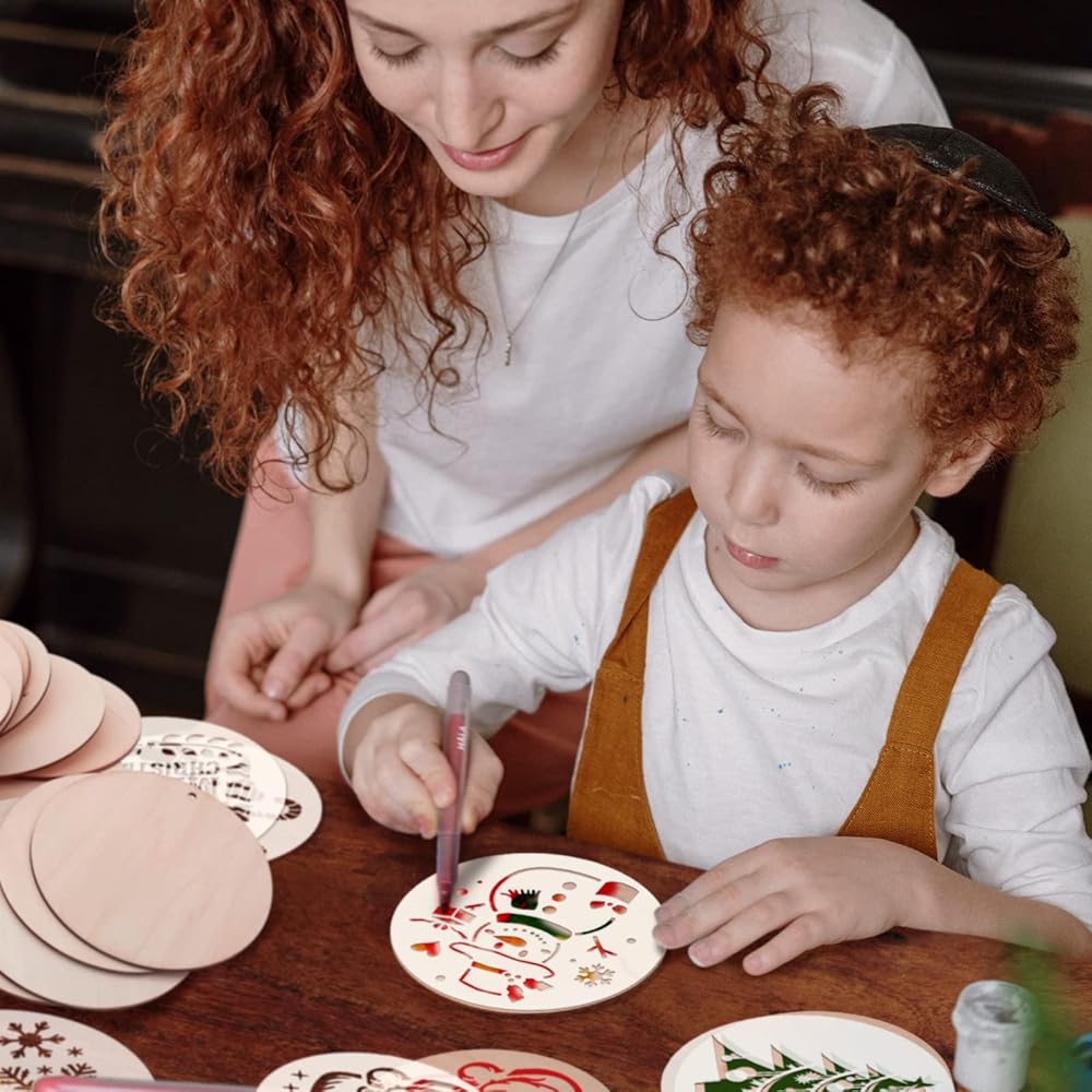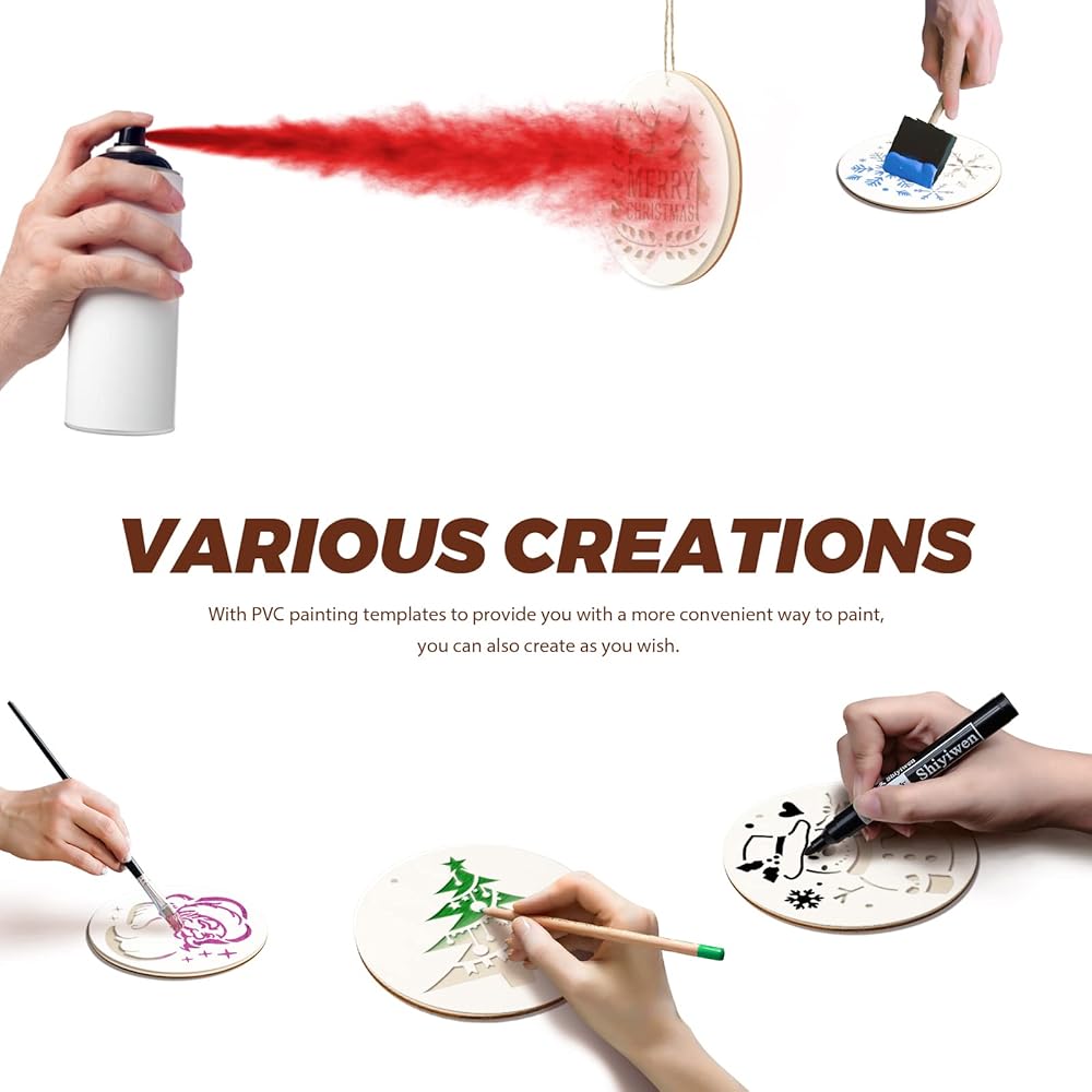 مادة فاخرة: الحلقات الخشبية مصنوعة من خشب رقائقي طبيعي عالي الجودة قوي ومتين وصديق للبيئة وخفيف الوزن، سطح الخشب المستدير غير المكتمل مقطوع بالليزر، بدون نتوءات. استنسل عيد الميلاد هذا القابل لإعادة الاستخدام مصنوع من مادة بلاستيكية صديقة للبيئة، وغير سامة وعديمة الرائحة، بدون حافة حادة.