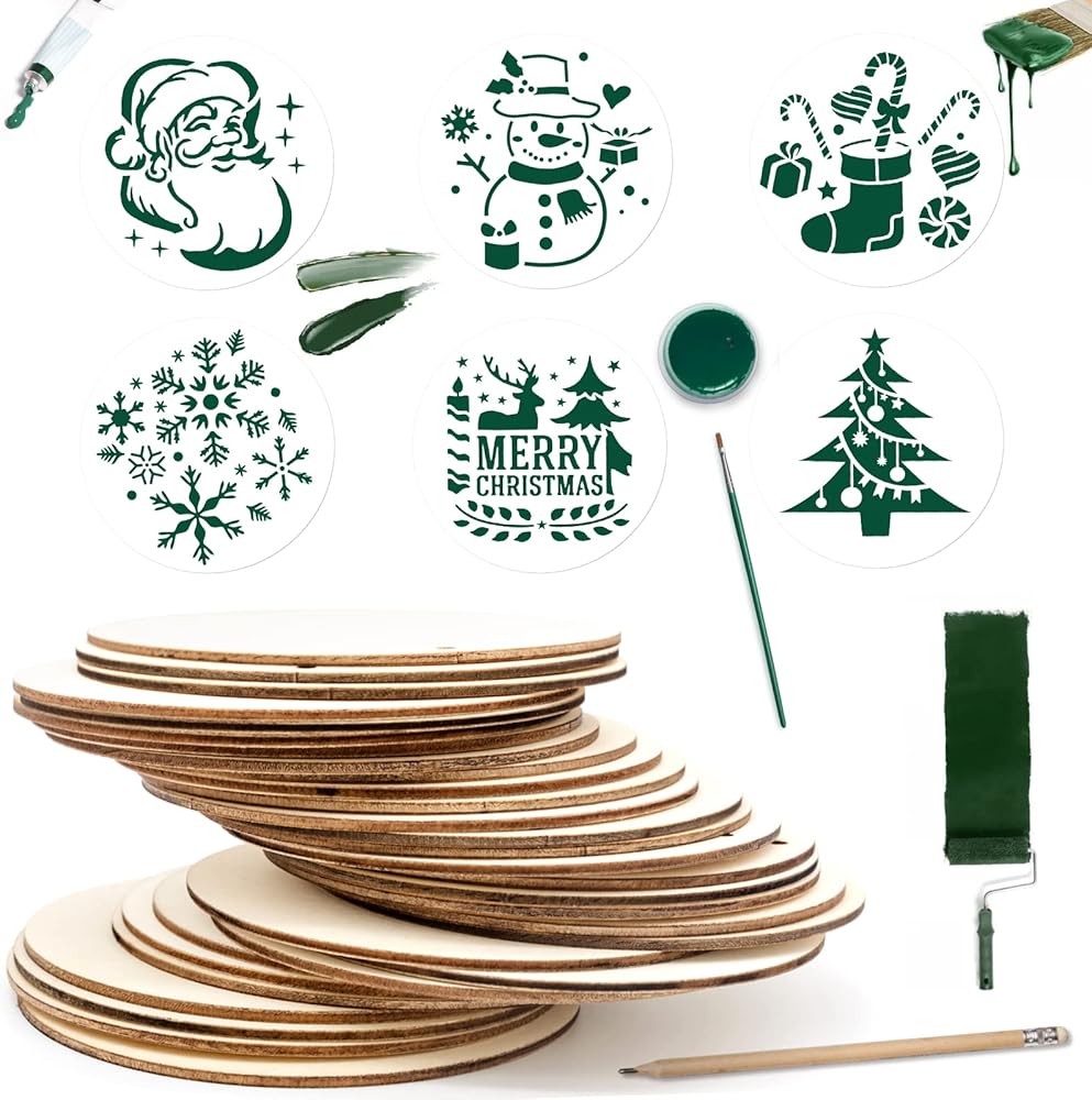 30 قطعة من دوائر الخشب غير المكتملة مع فتحات 5.12 بوصة و6 قطع من استنسل عيد الميلاد من Svemei، خشب مستدير طبيعي مع فتحة، علامات تزيين معلقة لحفلات عيد الميلاد