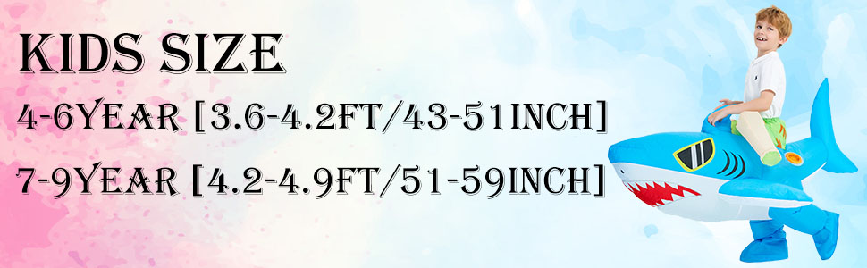 【Perfect Size】Inflatable costume for kids have two size: 4-6Year old kids suit [3.6-4.2ft/43-51inches] tall; 7-10Year old kids suit [4.2-4.9ft/51-59inches]
