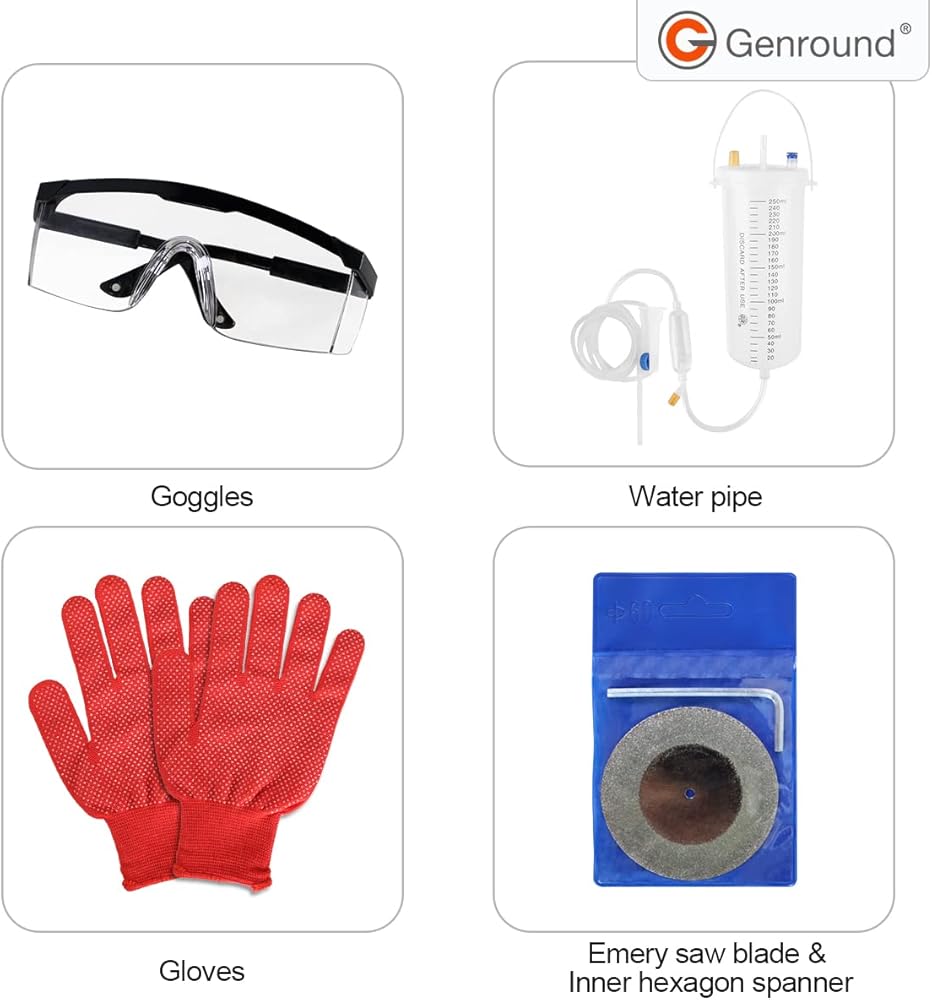 ماكينة تقطيع الزجاجات مع مصدر طاقة بـ 7 سرعات، 2 × شفرة منشار احتياطية، 5 × مفتاح ربط، 1 × مفتاح ظرف، 1 × أنبوب مياه، 1 × فتاحة فتحات، زوج من القفازات.