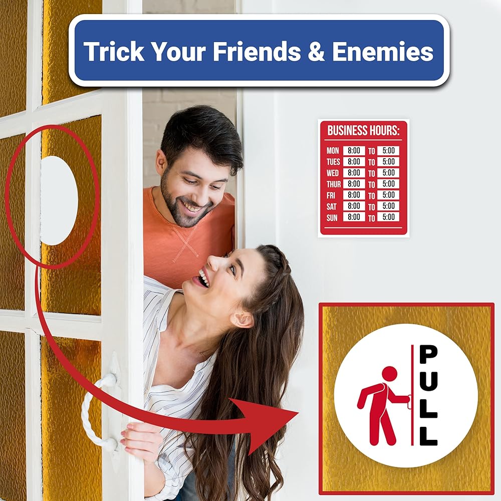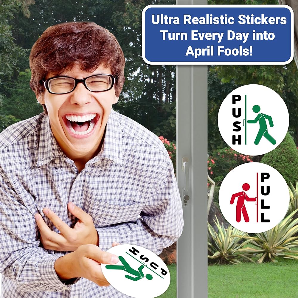 If you're looking for the perfect prank that no one will suspect, then look no further! These glossy push and pull stickers appear so professional and genuine, no one will doubt them. Our big, 5-inch decals with graphic door-opening directions will trick men, women, teens and kids of all ages!