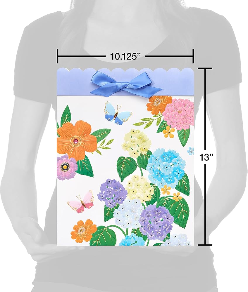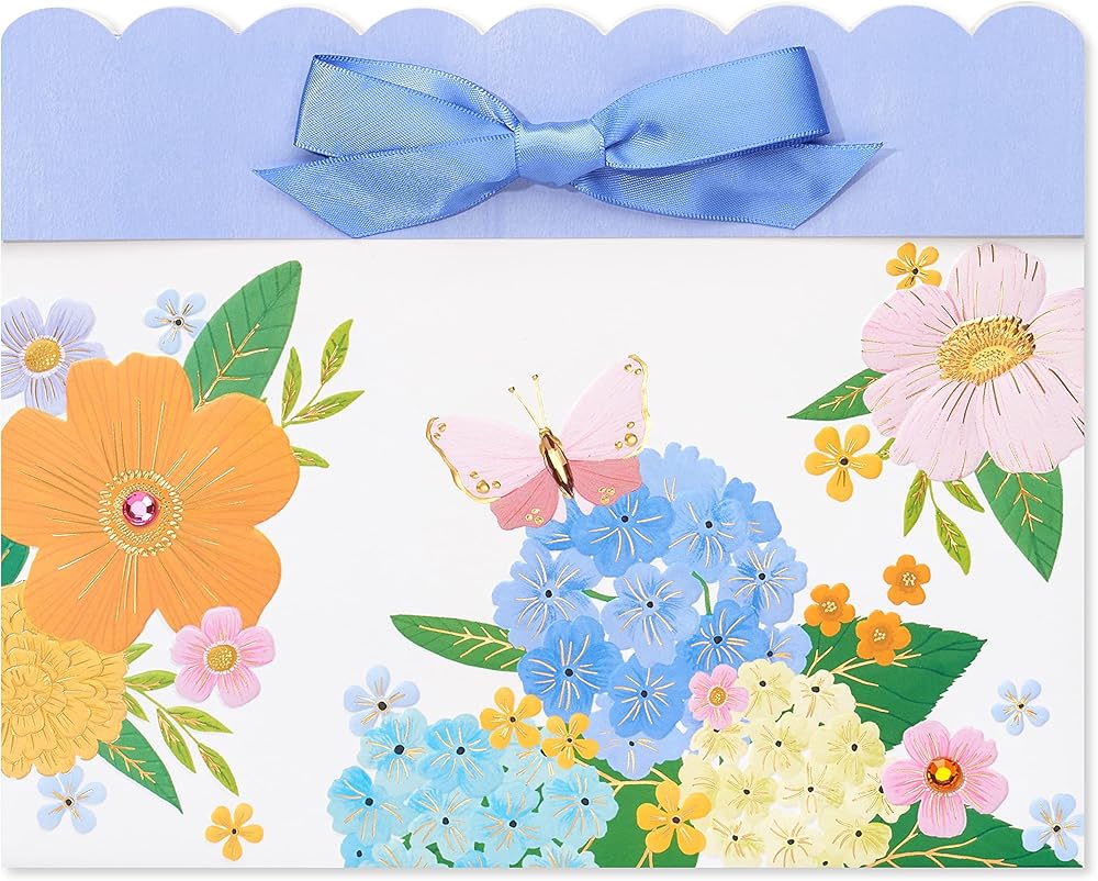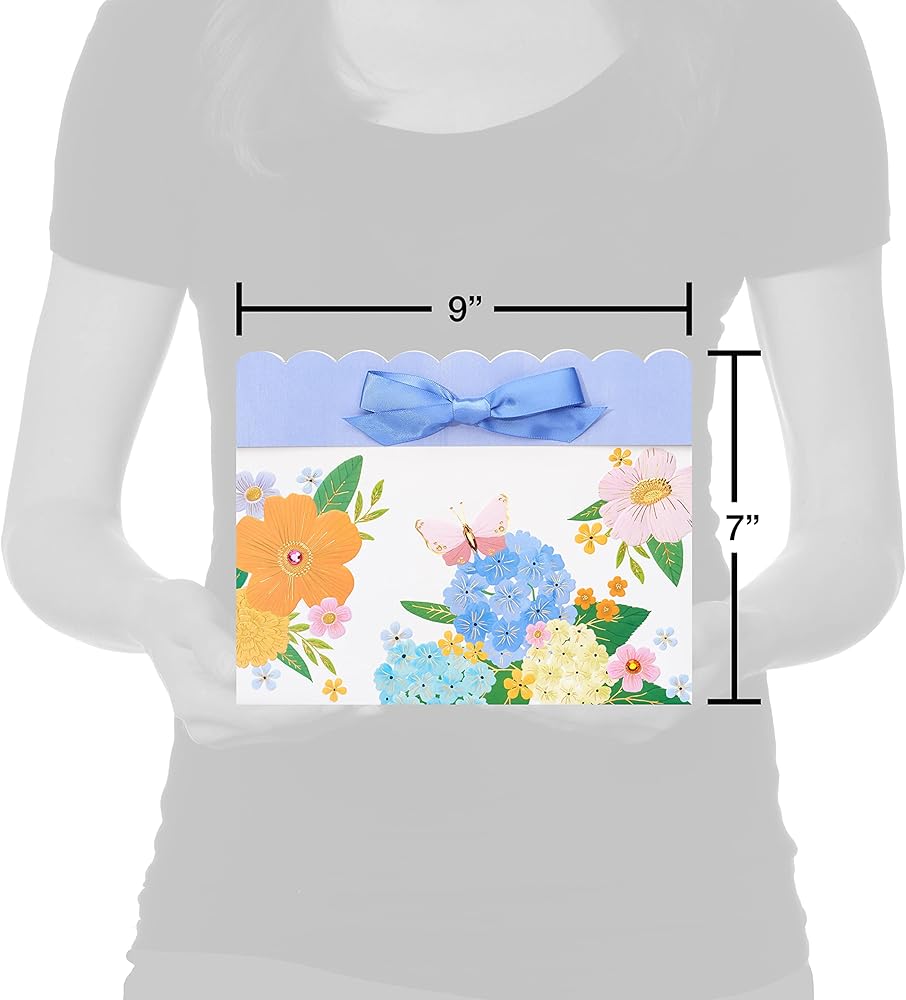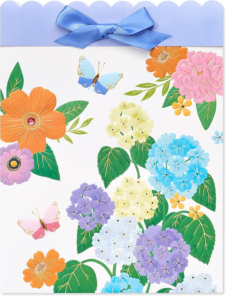 Make someone's gift even more special with this beautiful gift bag from Papyrus! This contemporary premium bag features scalloped edges and a floral design with metallic foil, gems, embossing, paper attachments, and satin ribbon handles. Make your presentation more gorgeous with Papyrus tissue paper (sold separately) for the perfect finishing touch. Great for Mother's Day, a birthday, or just because. Medium gift bags from Papyrus are perfect for wrapping special gifts like clothing, home decor items, toys, stuffed animals, electronics and other hard-to-wrap presents. Crafted with the finest materials, Papyrus gift bags are sure to enhance your gift presentations in unique ways!
